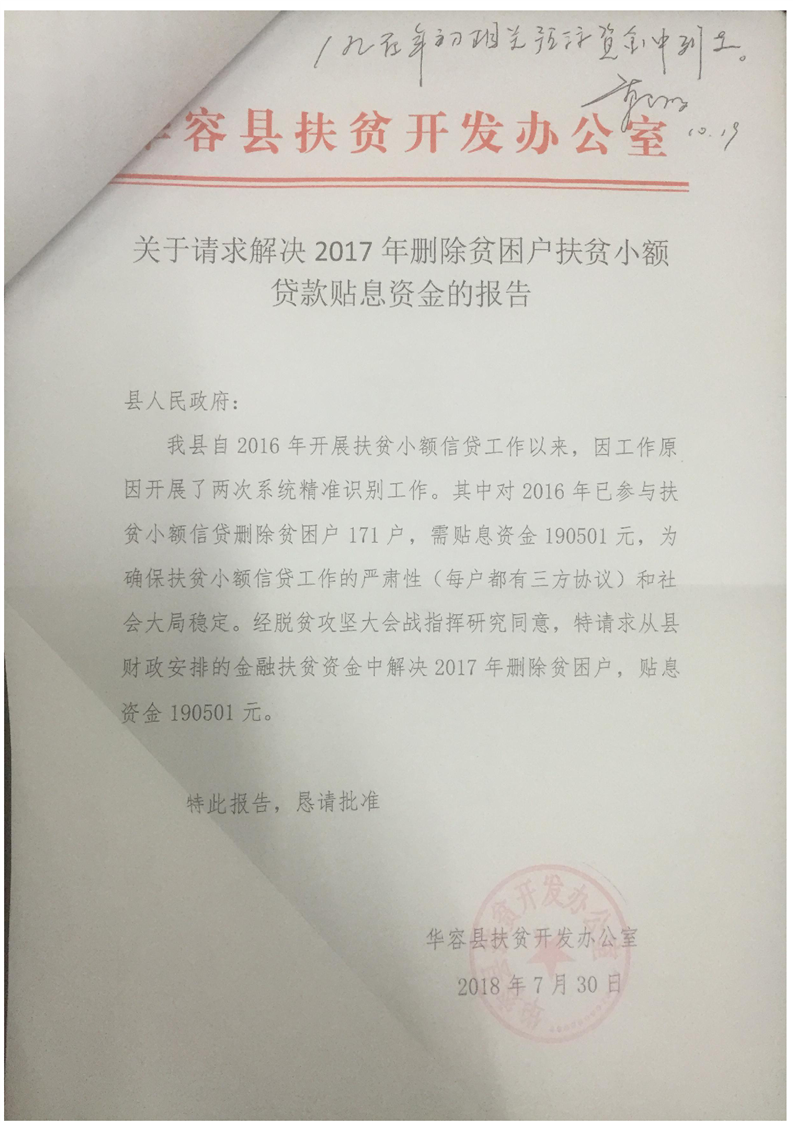 关于请求解决2017年删除贫困户扶贫小额贷款贴息资金的报告 19.0501