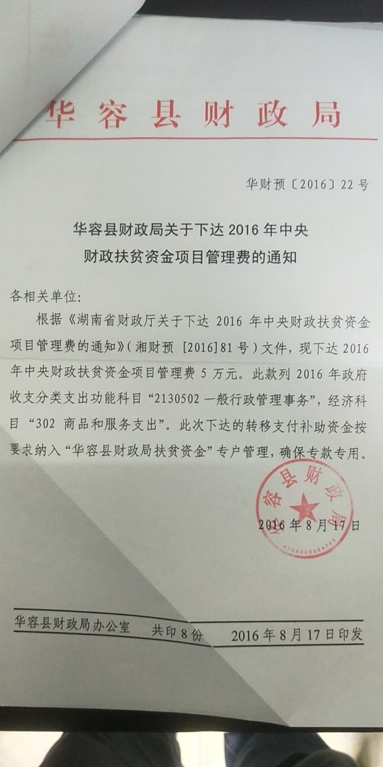2016年关于下达中央财政扶贫资金项目管理费的通知-5万