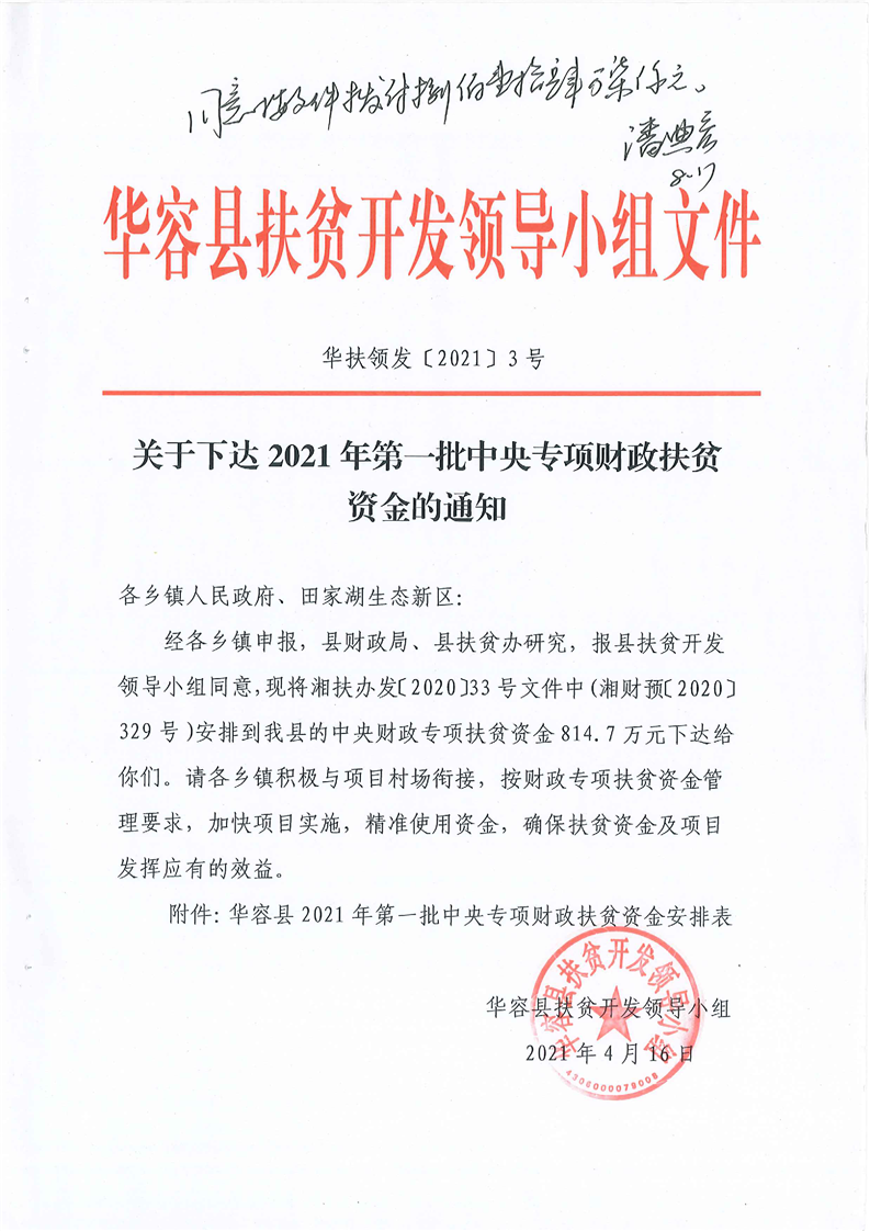 华扶领发(2021)3号-关于下达2021年第一批中央专项财政扶贫资金的通知-814.7万元