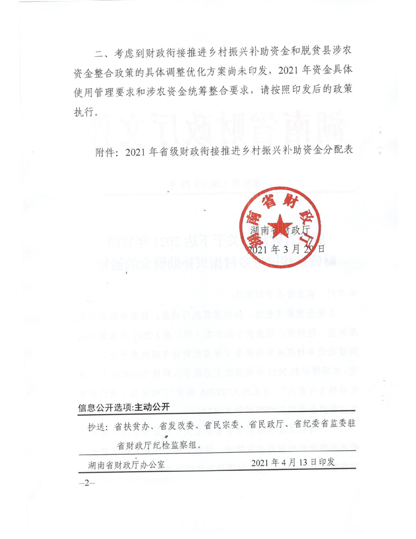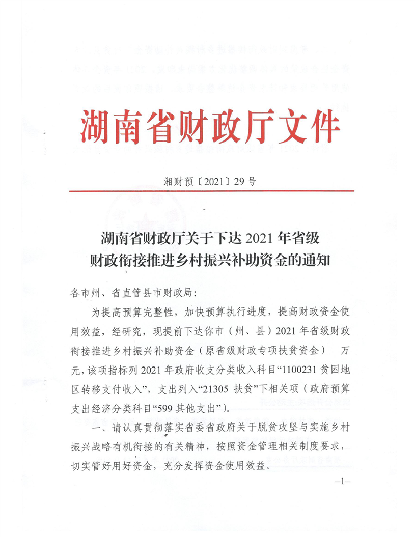 湖南省财政厅关于下达2021年省级财政衔接推进乡村振兴补助资金的通知(湘财预【2021】29号)