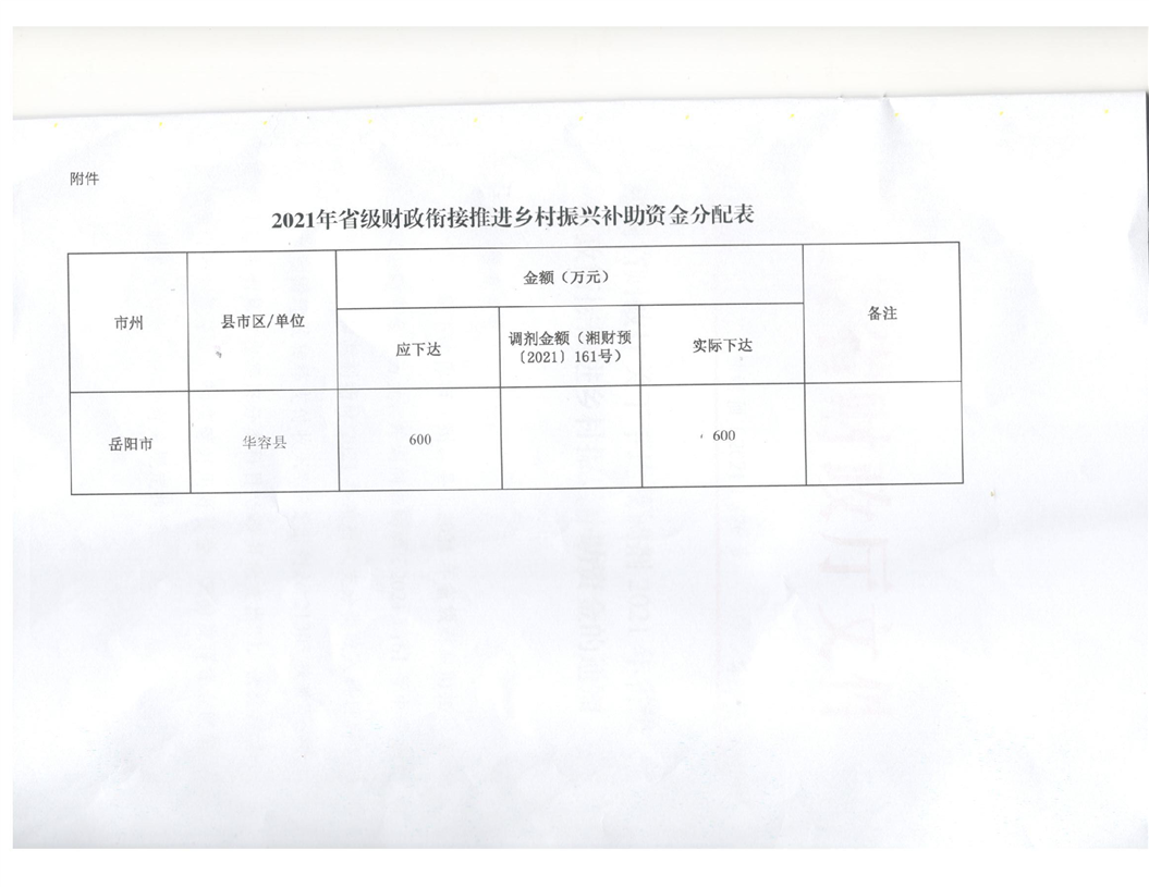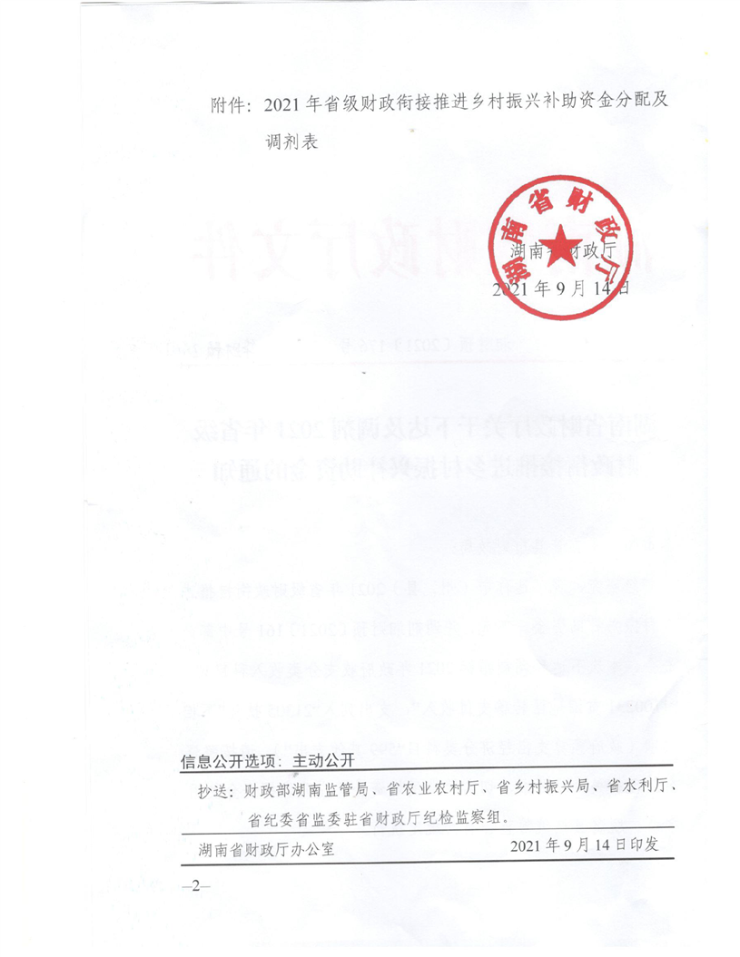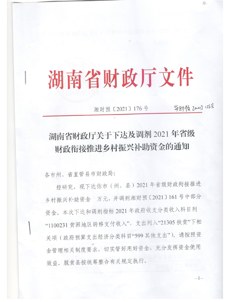 湖南省财政厅关于下达及调剂2021年省级财政衔接推进乡村振兴补助资金的通知(湘财预【2021】176号)