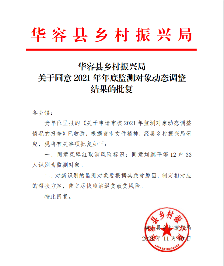 华容县乡村振兴局关于同意2021年年底监测对象动态调整结果的批复