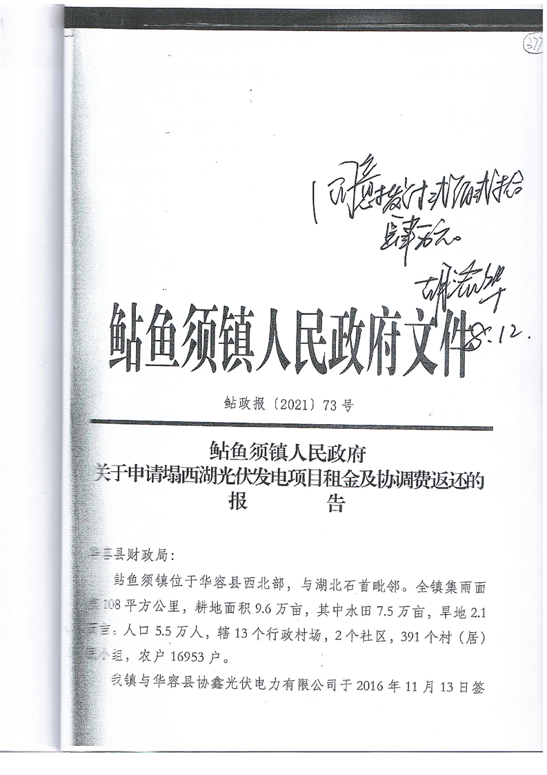 关于申请塌西湖光伏发电项目租金及协调费返还的报告