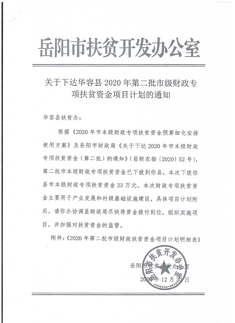 关于下达华容县2020年第二批市级财政专项扶贫资金项目计划的通知-23万