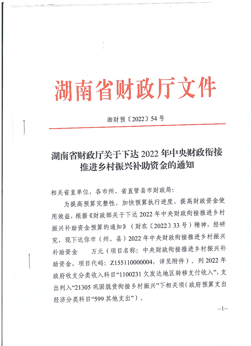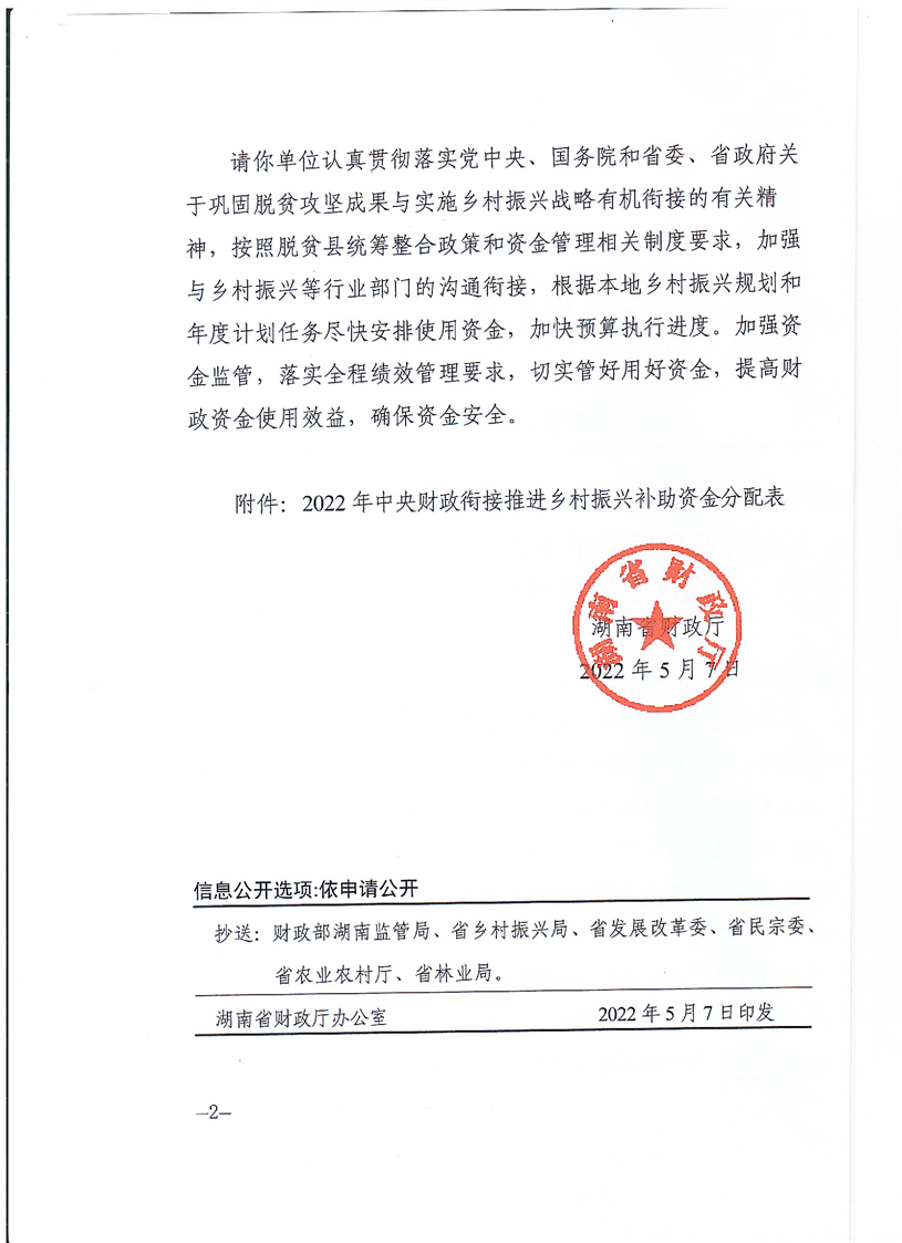 湖南省财政厅关于提前下达2022年中央第二批财政衔接推进乡村振兴补助资金的通知-901万