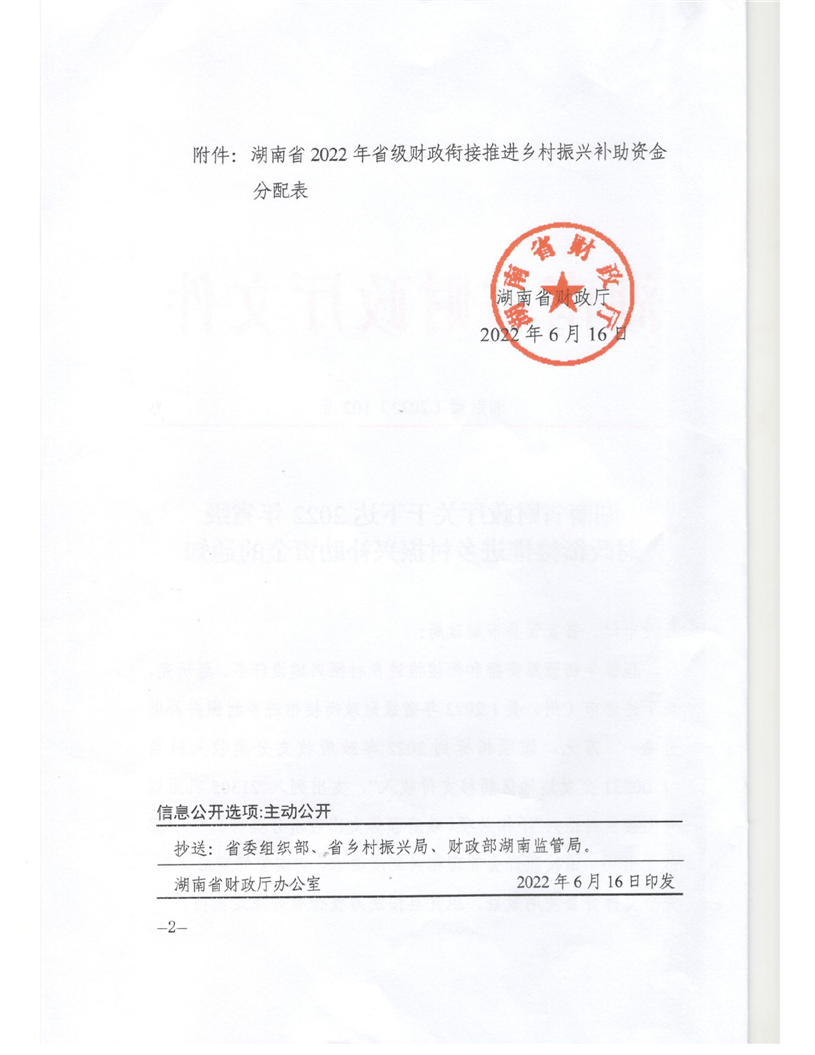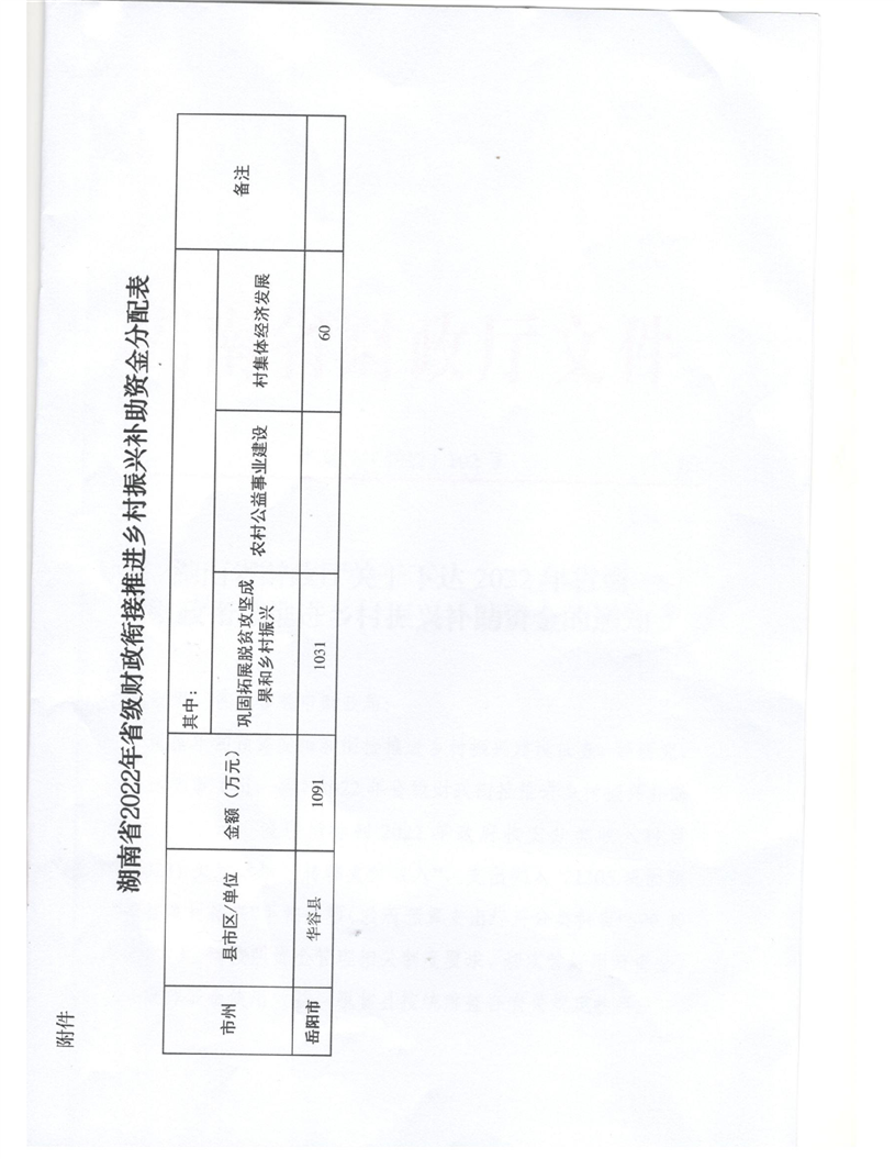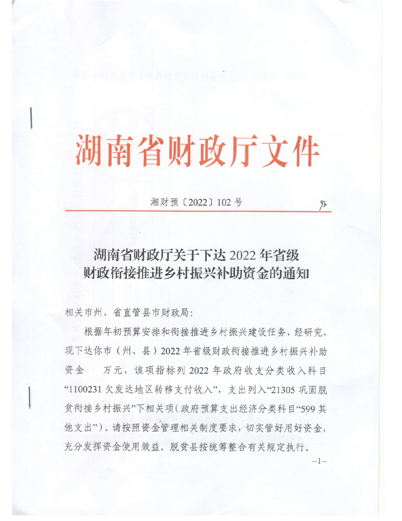湖南省财政厅关于下达2022年省级财政衔接推进乡村振兴补助资金的通知1091.00万