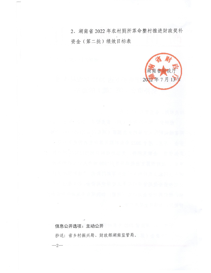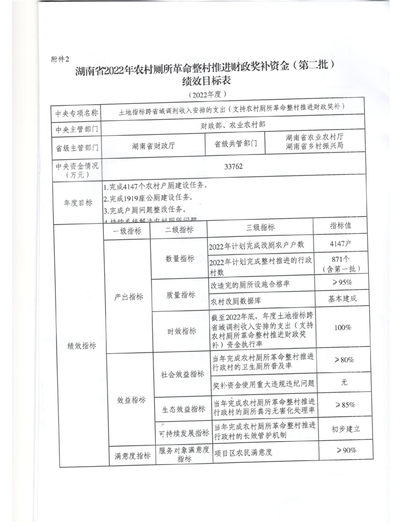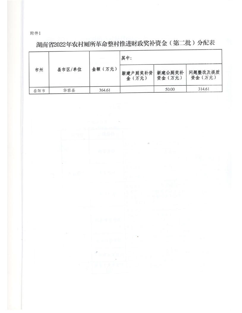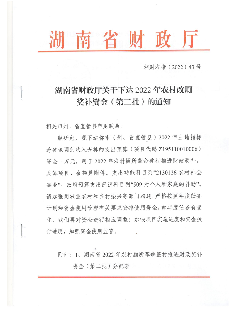 湖南省财政厅关于下达2022年农村改厕奖补资金(第二批)的通知-364.61万