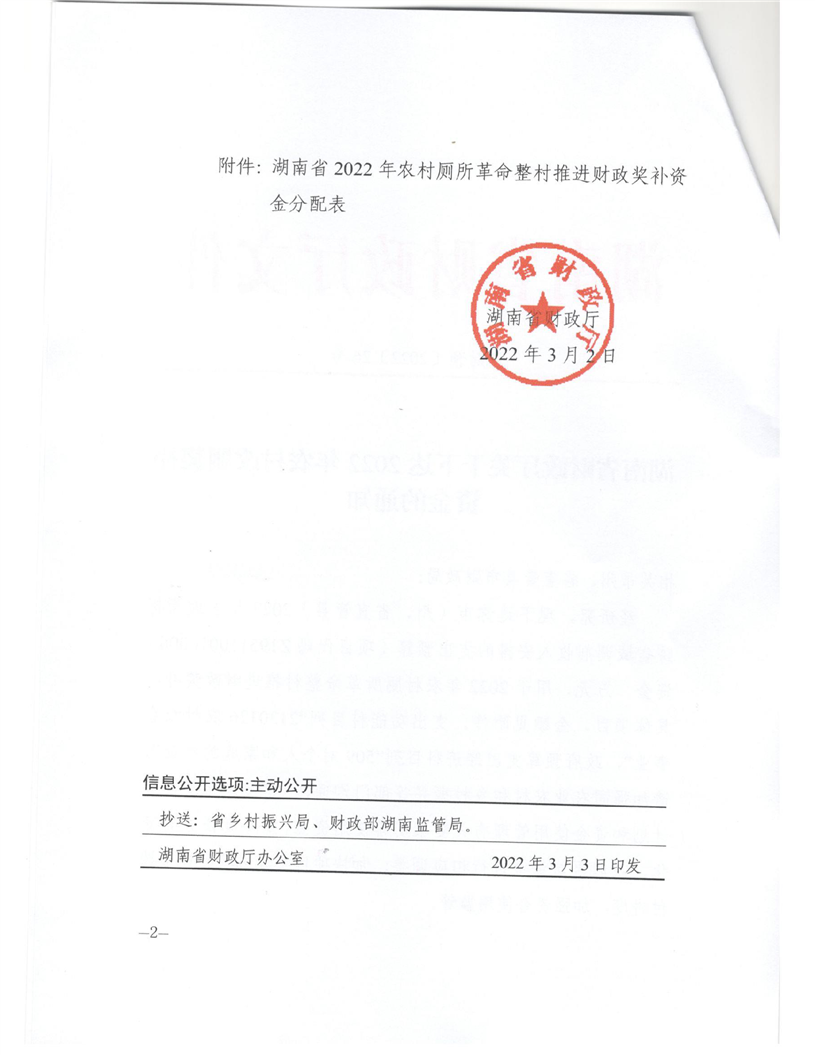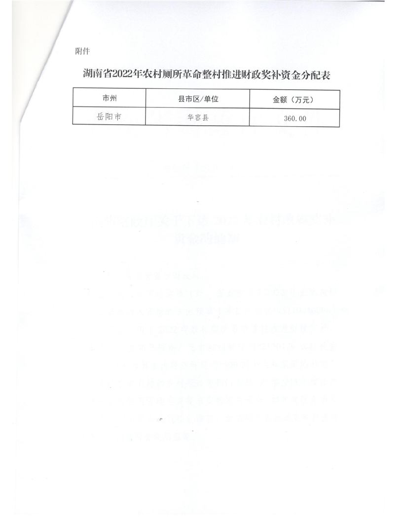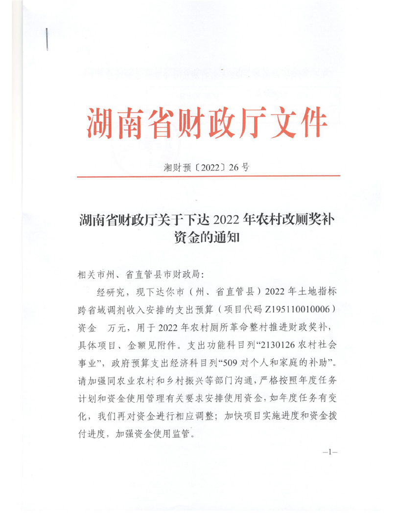湖南省财政厅关于下达2022年农村改厕奖补资金的通知-360.00万