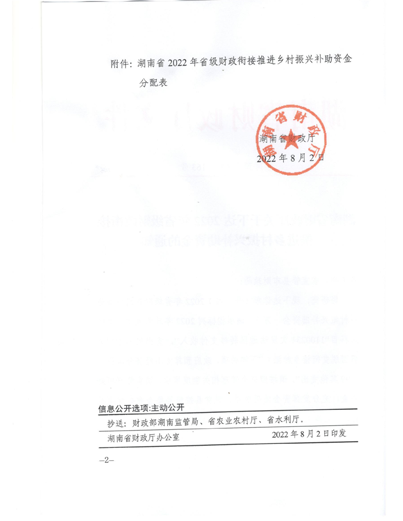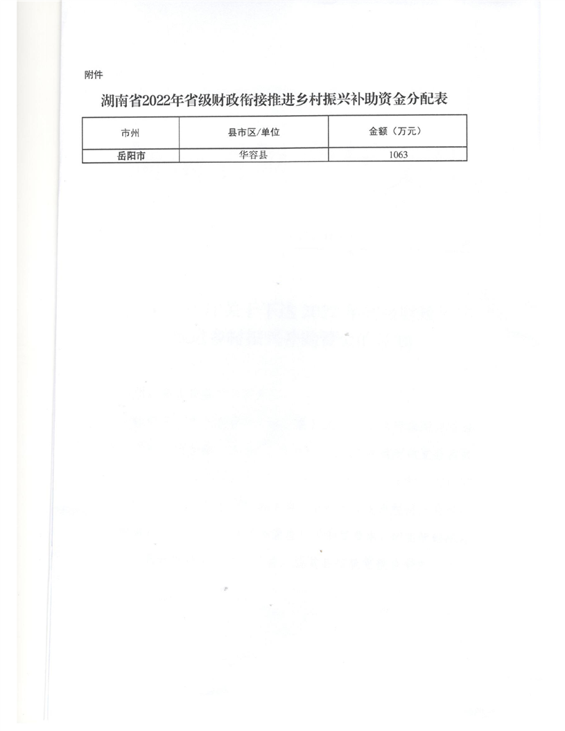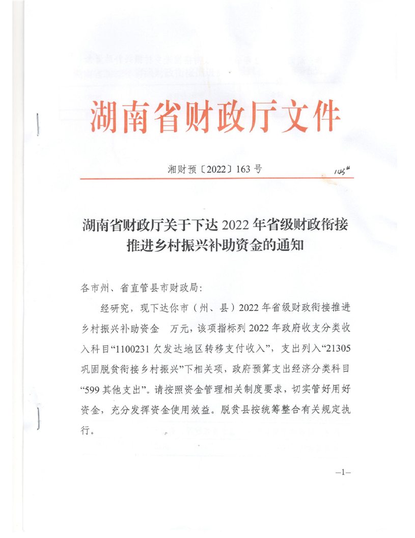湖南省财政厅关于下达2022年省级财政衔接推进乡村振兴补助资金的通知-1063.00万