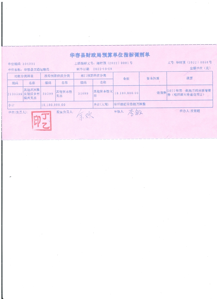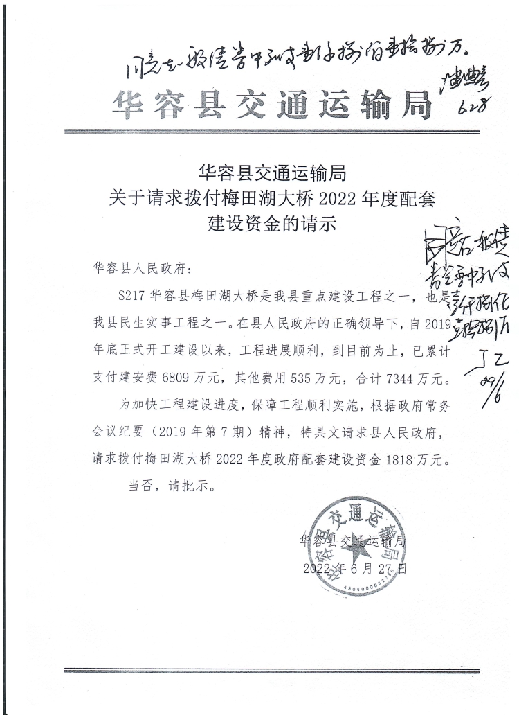2022年度梅田湖大桥配套建设资金1818万(县级)