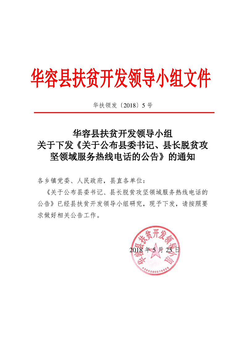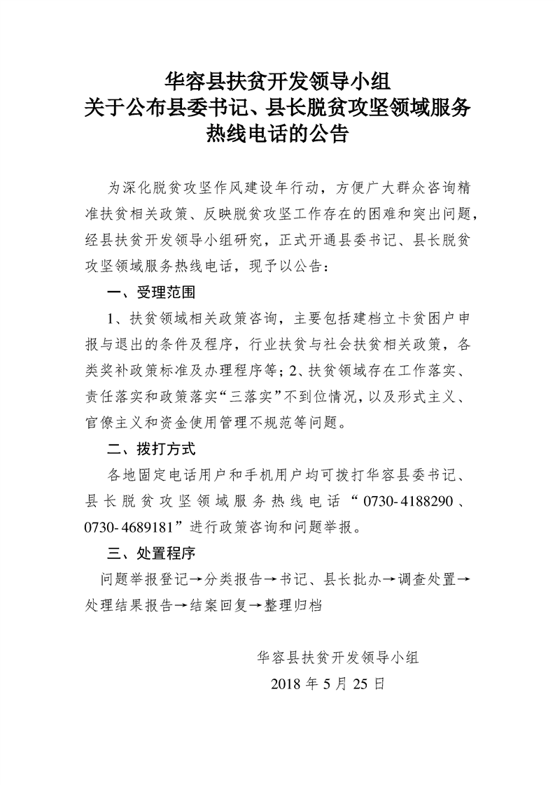 关于公布县委书记、县长脱贫攻坚领域服务热线电话的公告