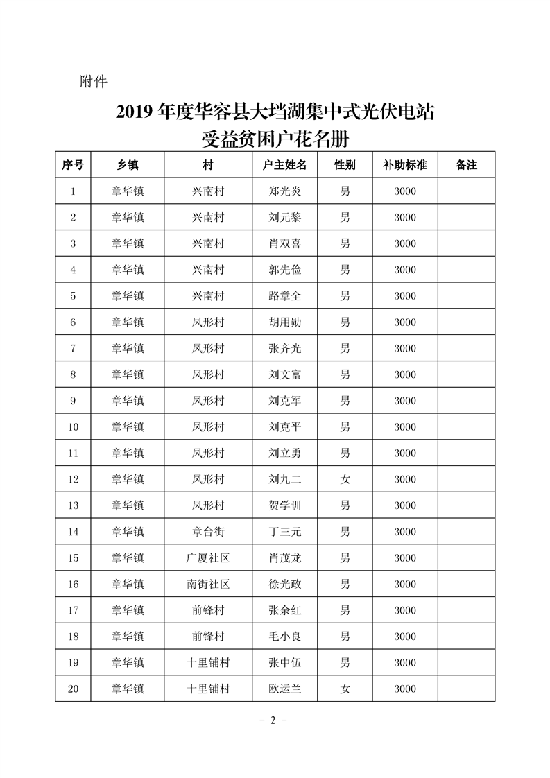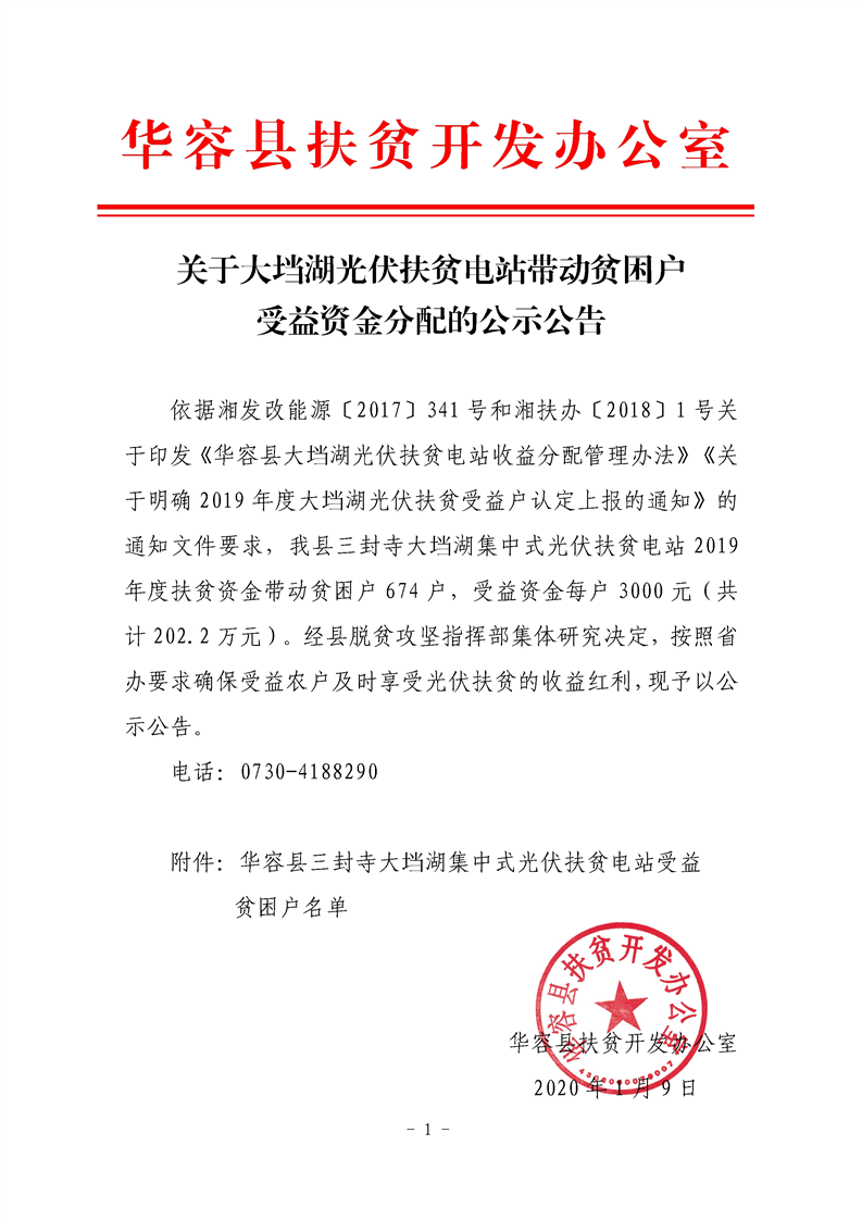 关于拨付大垱湖光伏扶贫电站带动贫困户受益资金分配的公示公告(2019)