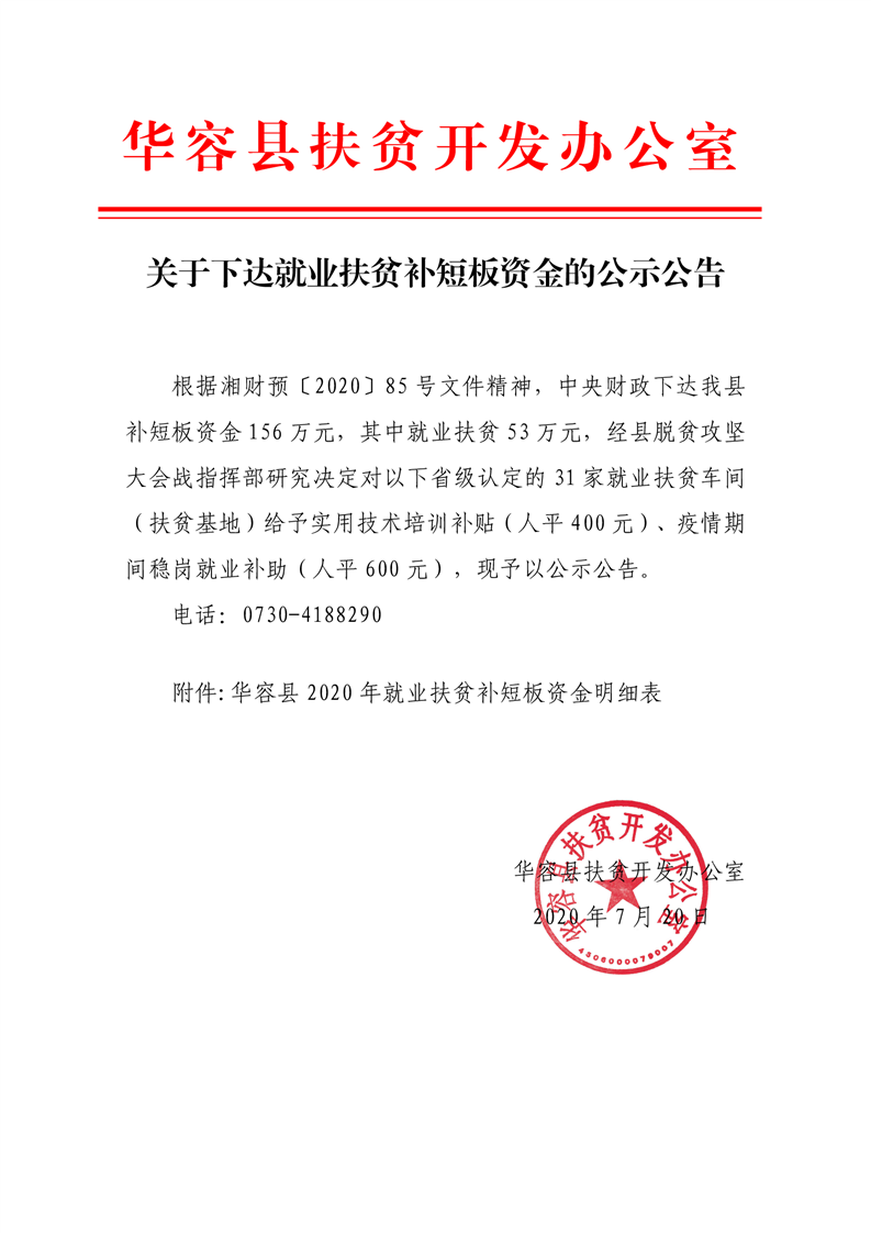 关于2020年就业扶贫车间稳岗补助奖补资金的公示公告