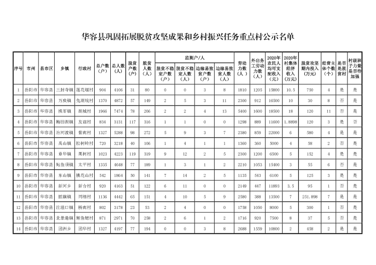 华容县巩固拓展脱贫攻坚成果和乡村振兴任务重点村公示 名单