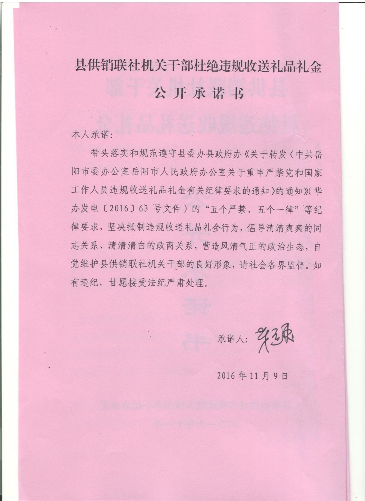 县供销联社机关干部杜绝违规收送礼品礼金公开承诺书(蔡远惠)
