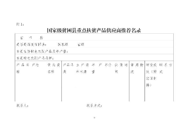 2019年9月15日前,各省级扶贫部门将本地区贫困县填写的《贫困县重点扶贫产品供应商推荐名录》(附1)和审核认定后的《贫困县重点扶贫产品供应商建议名录》(附2)报国务院扶贫办汇总。