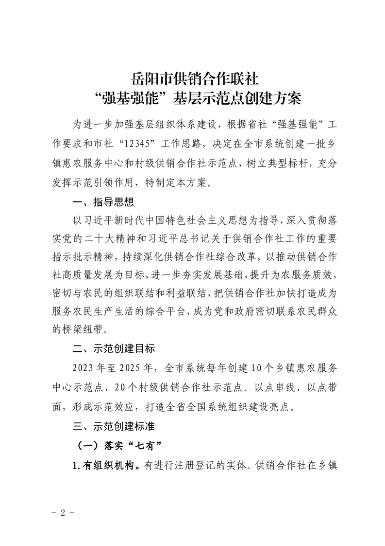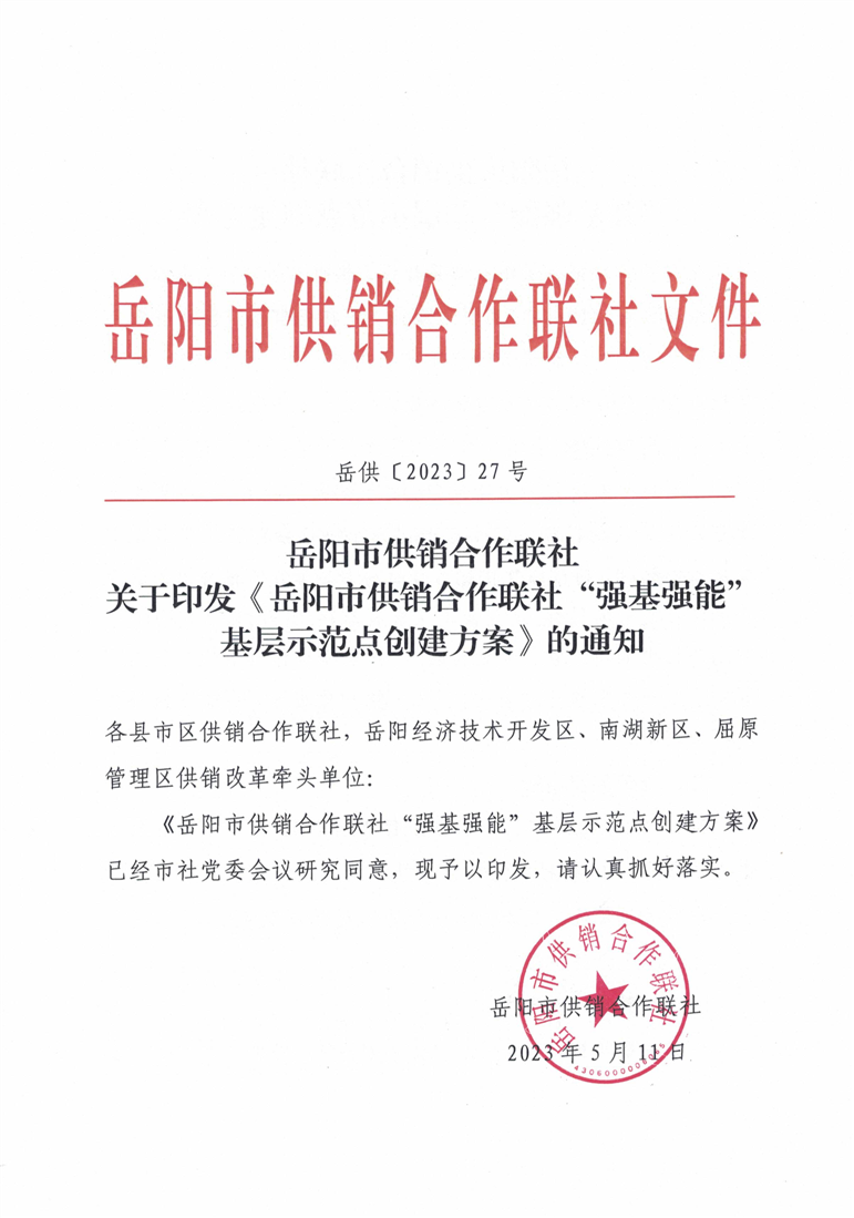 岳阳市供销合作联社关于印发《岳阳市供销合作联社“强基强能”基层示范点创建方案》的通知