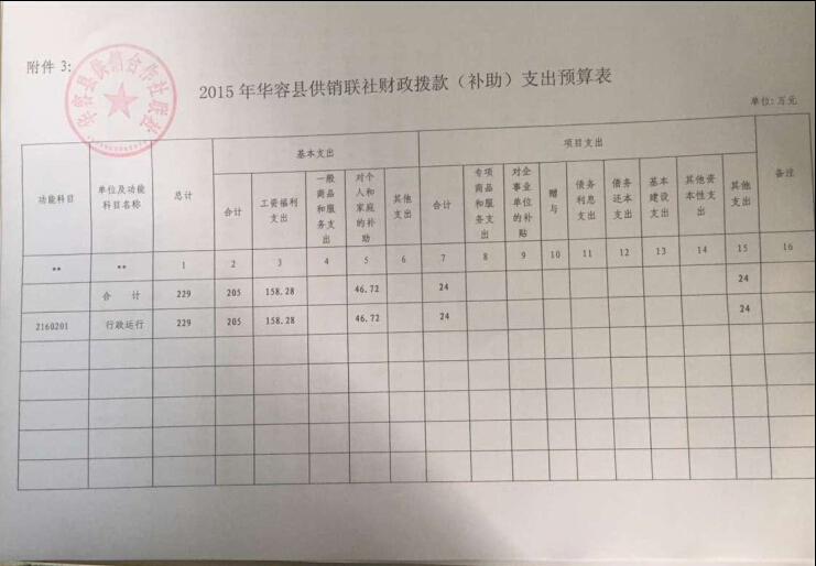 2015年华容县供销联社财政拨款(补助)支出预算表