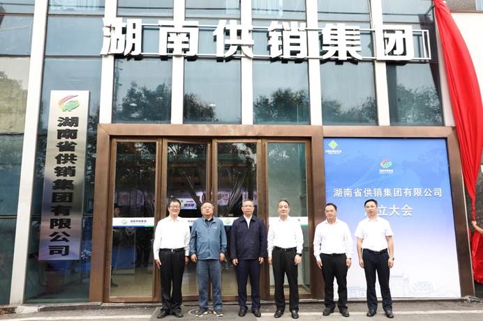 9月23日,湖南省供销集团有限公司成立大会暨揭牌仪式在长沙举行。中华全国供销合作总社党组成员、理事会副主任,中国供销集团党委书记、董事长侯顺利,省人大常委会副主任杨维刚,省政协副主席易鹏飞,省委副秘书长肖祥清,省供销合作总社党组书记、理事会主任刘湘凌,省供销社党组成员、总经济师,湖南供销集团董事长、总经理赵劲松共同为公司揭牌。