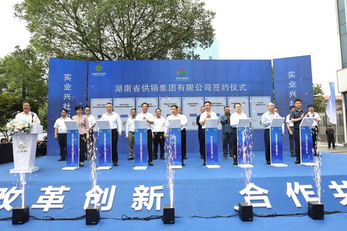 会上,湖南供销集团和中国工商银行股份有限公司湖南省分行、中国农业银行股份有限公司湖南省分行、中国建设银行股份有限公司湖南省分行、湖南省农村信用社联合社、长沙银行股份有限公司、中国邮政储蓄银行股份有限公司湖南省分行、中国建筑第五工程局有限公司等7家单位分别签订了《战略合作协议》,将在投融资、产业发展、冷链设施基础建设等领域深入开展合作,为公司未来发展提供强大助力。