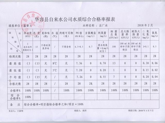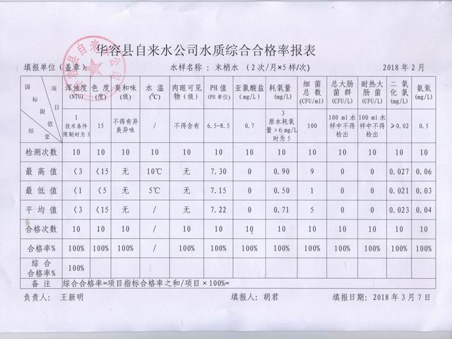 华容县自来水公司2018年02月份水质信息公开