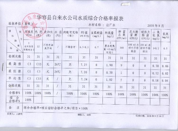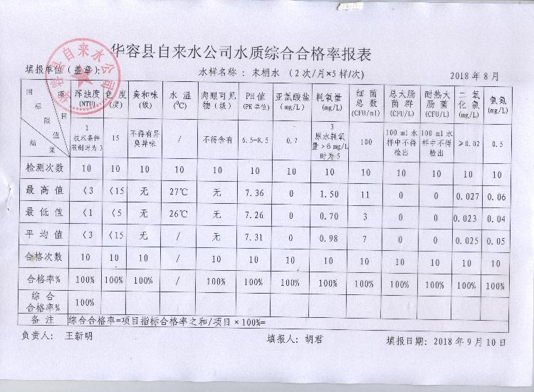 华容县自来水公司2018年08月份水质信息公开