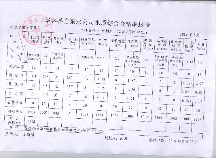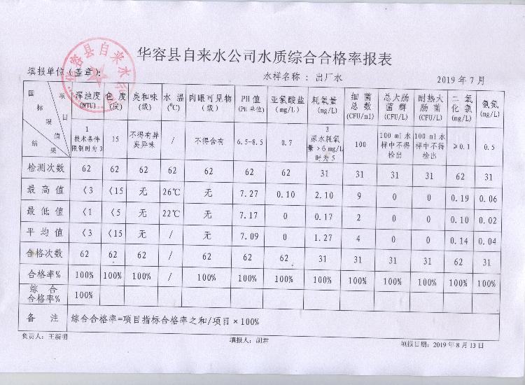 华容县自来水公司2019年7月份水质信息公开