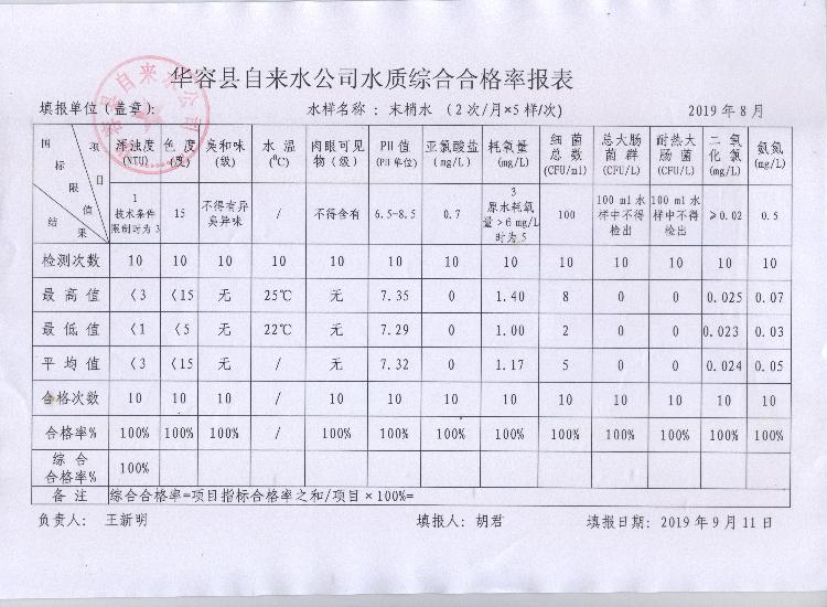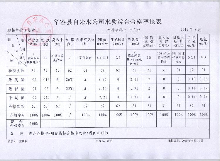 华容县自来水公司2019年8月份水质信息公开