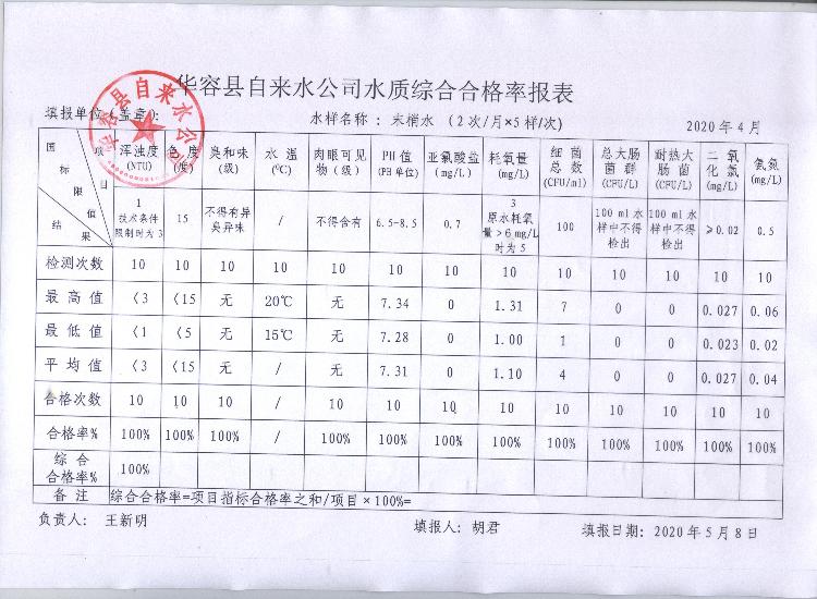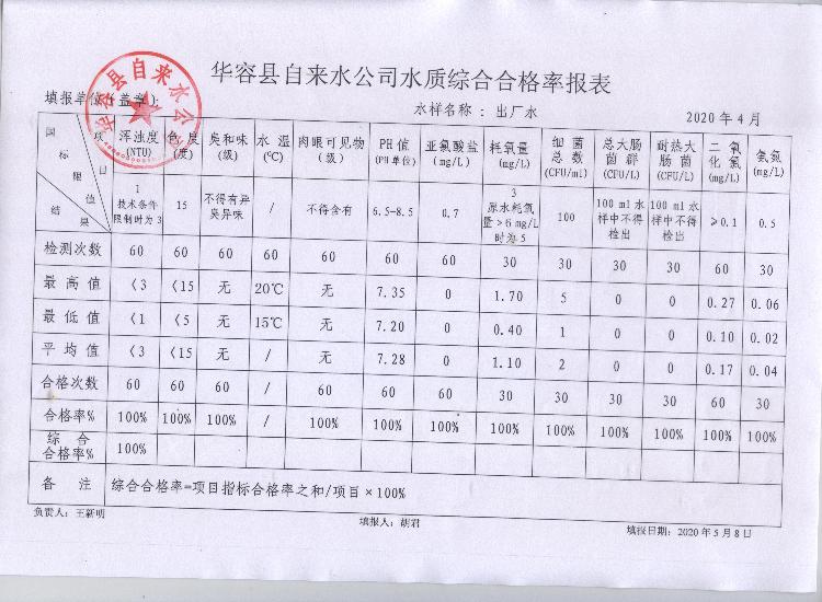 华容县自来水公司2020年4月水质信息公开
