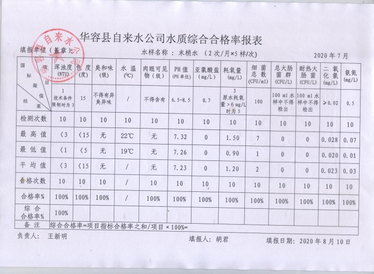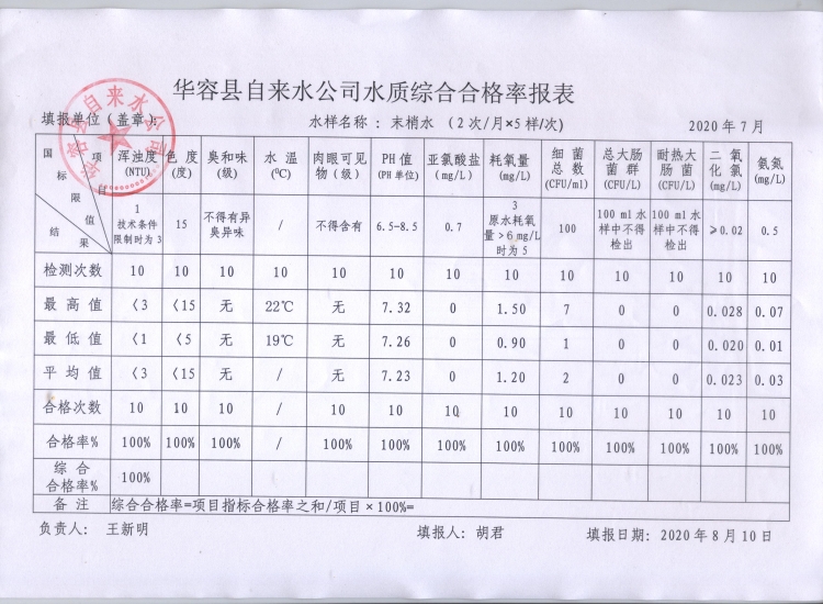 华容县自来水公司2020年7月水质信息公开