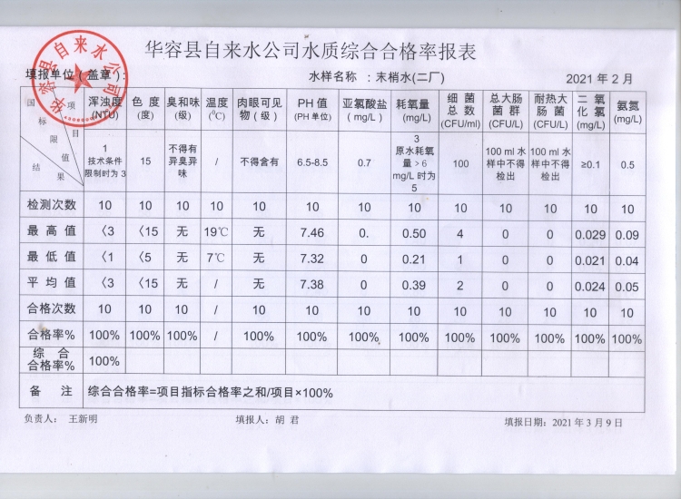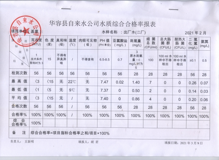 华容县自来水公司2021年2月水质信息公开