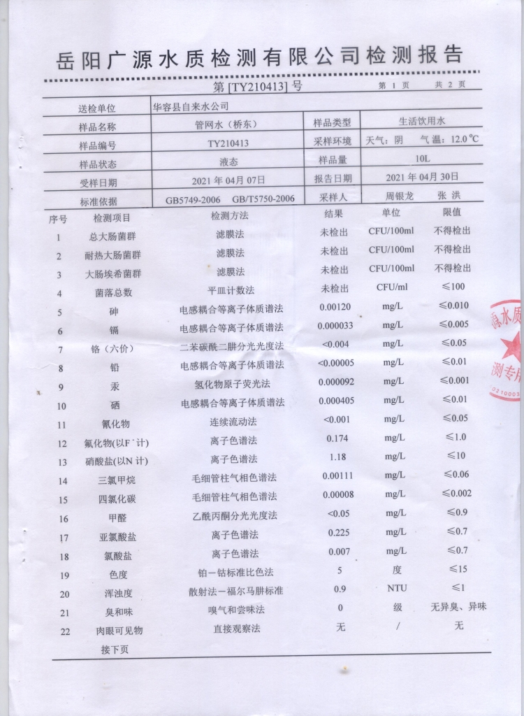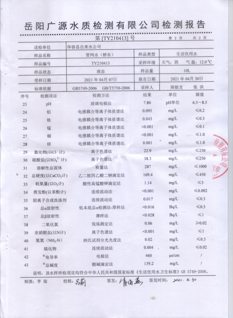 2021水质监测报告(管网水43项)