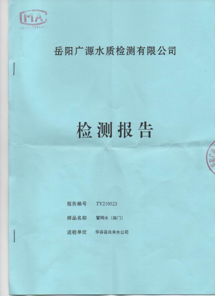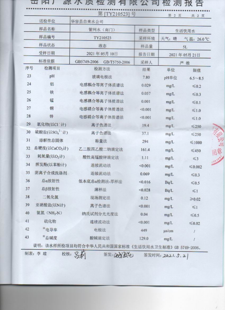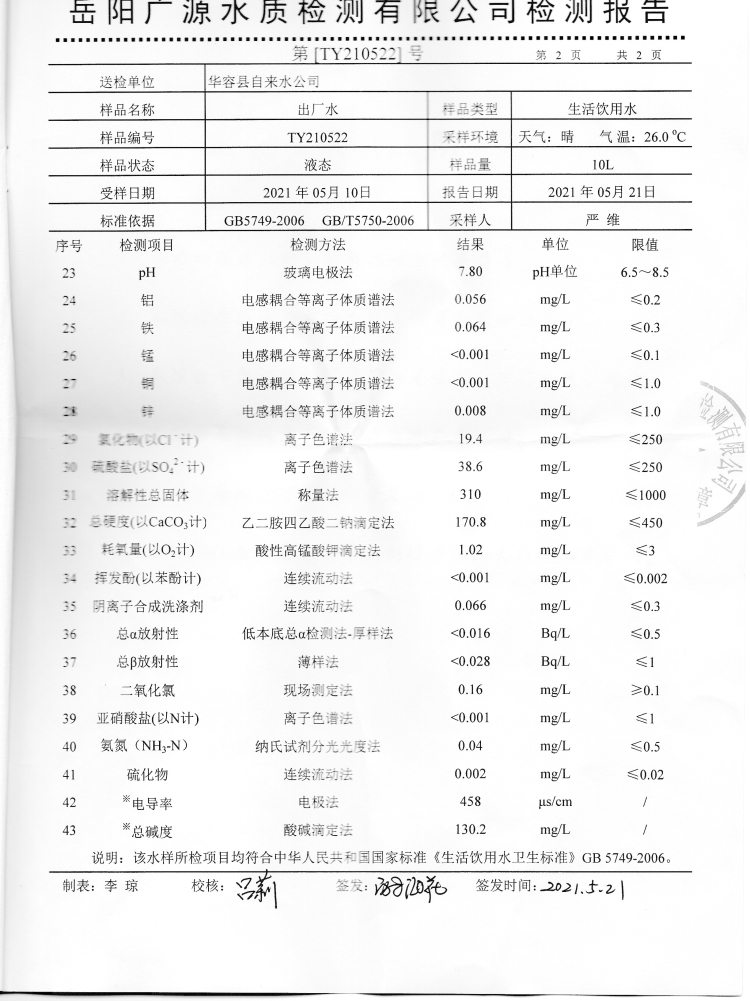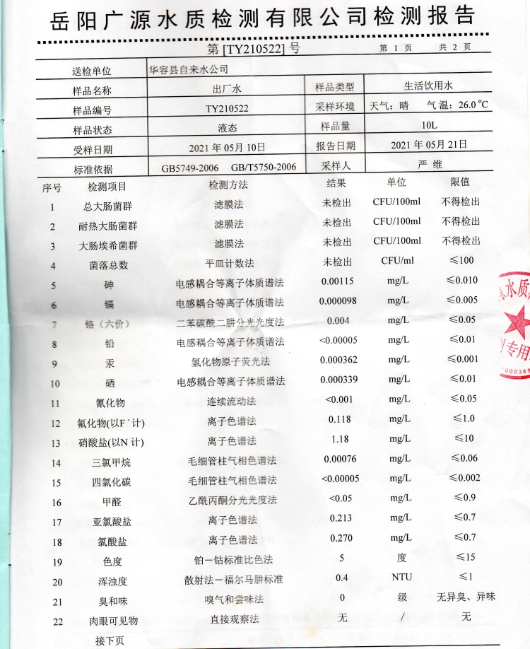 华容县自来水公司2021年5月出厂水,管网水,水质信息公开