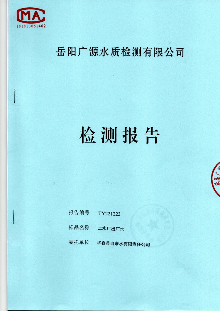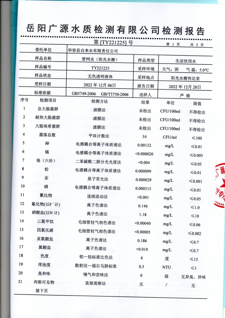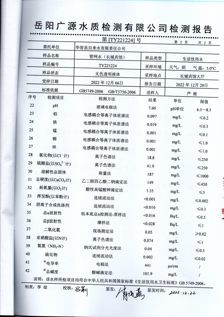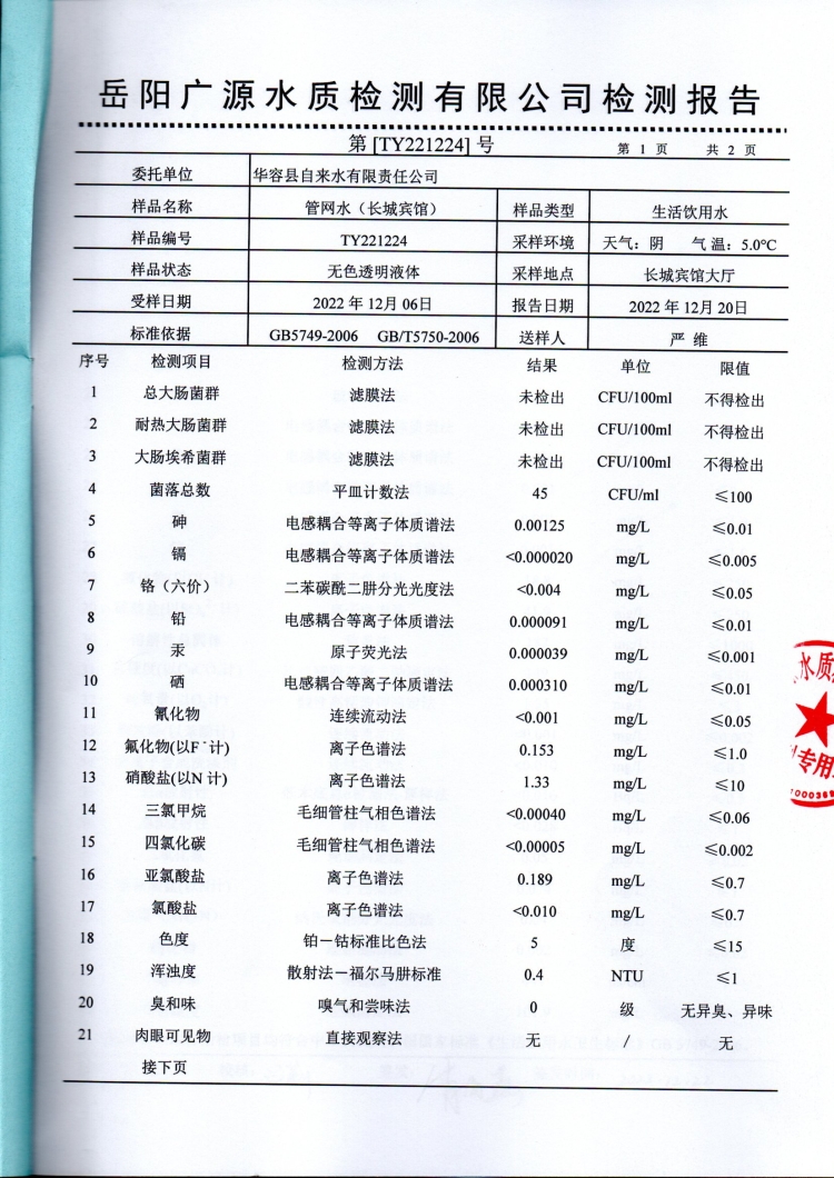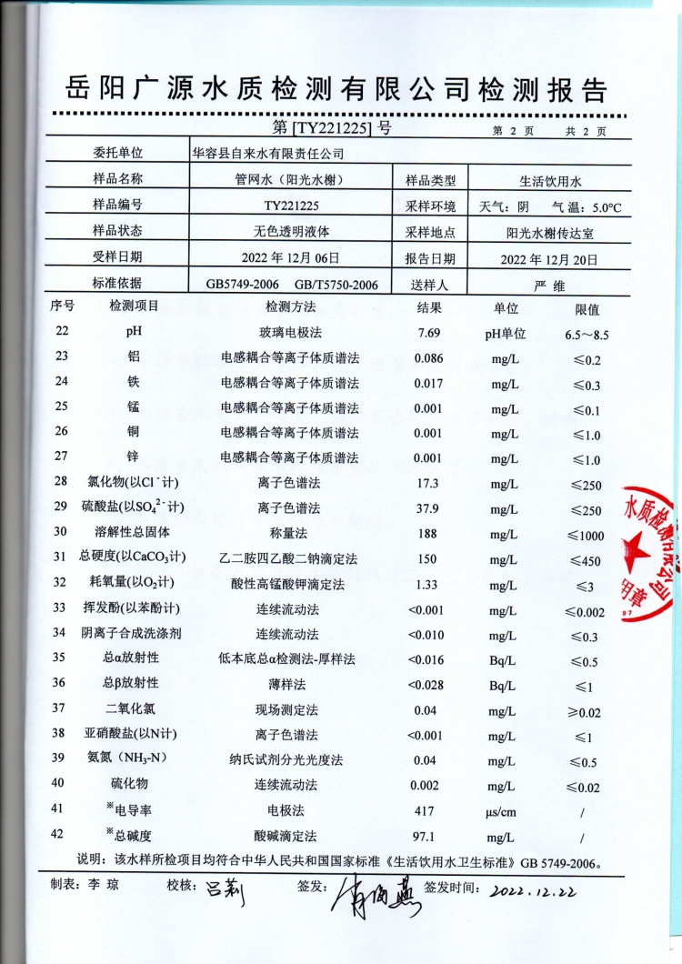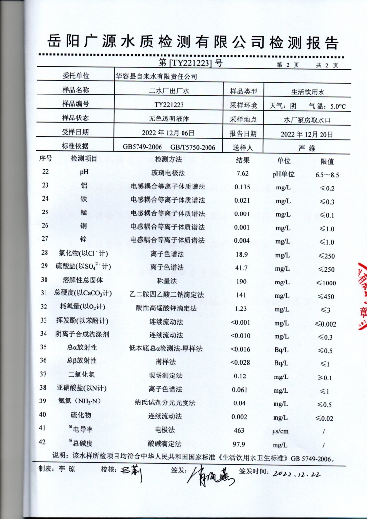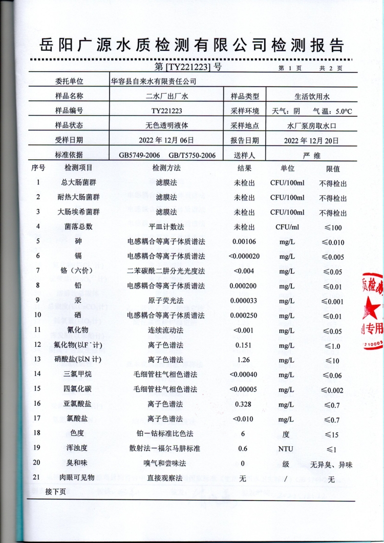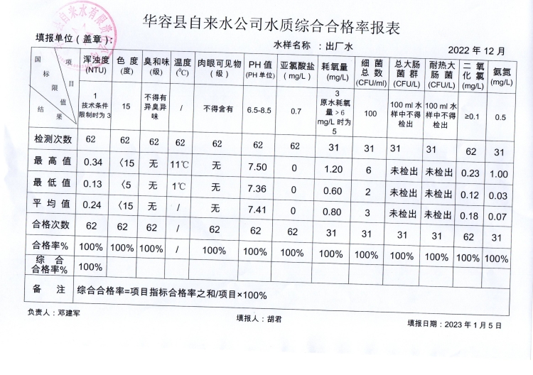 华容县自来水有限责任公司2022年12月水质信息公开