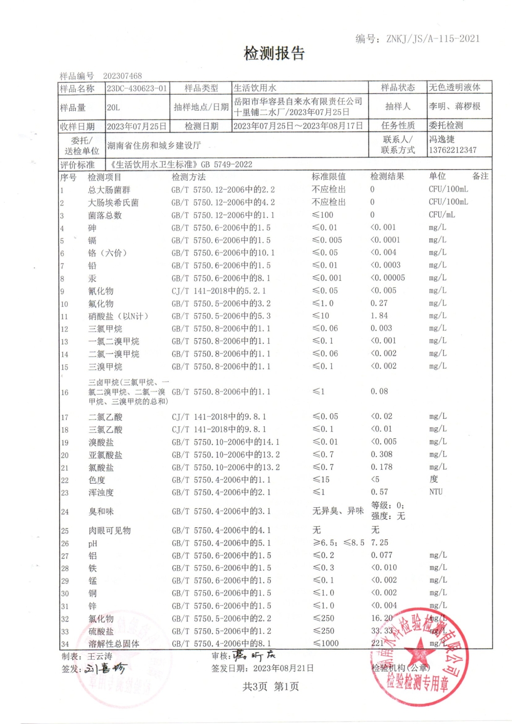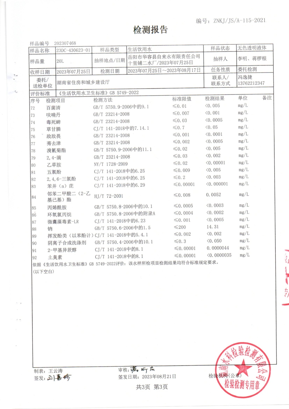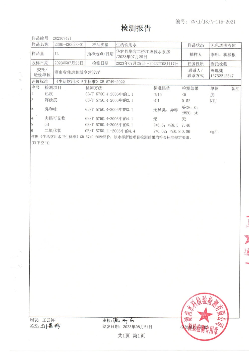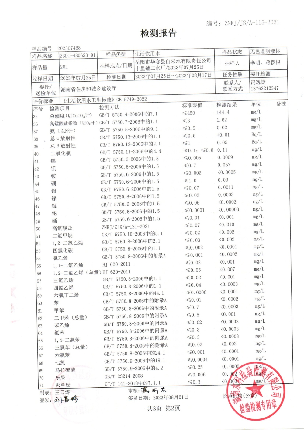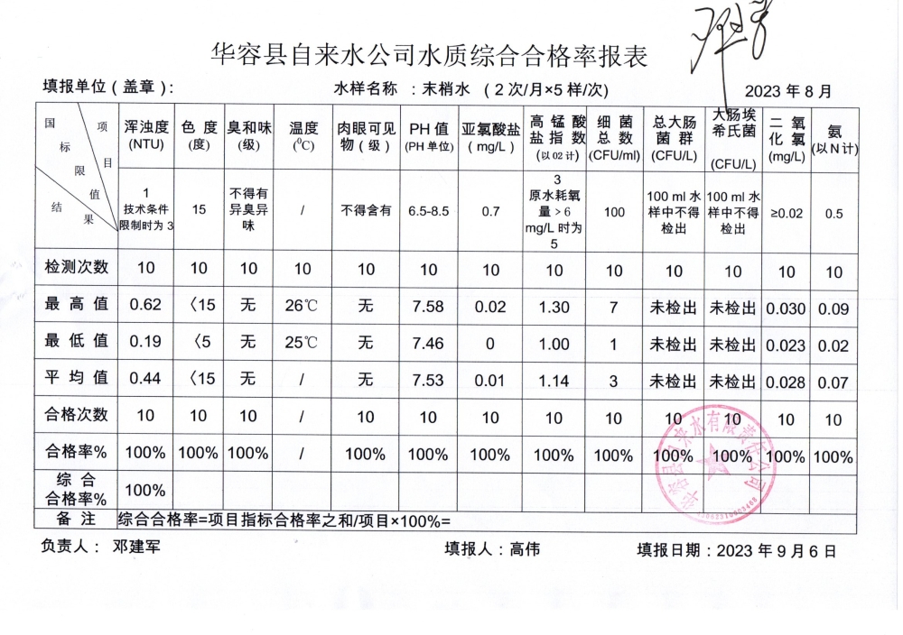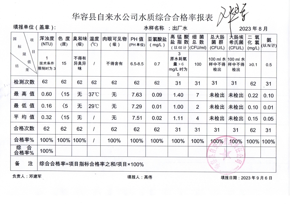 华容县自来水有限责任公司2023年8月水质信息公开