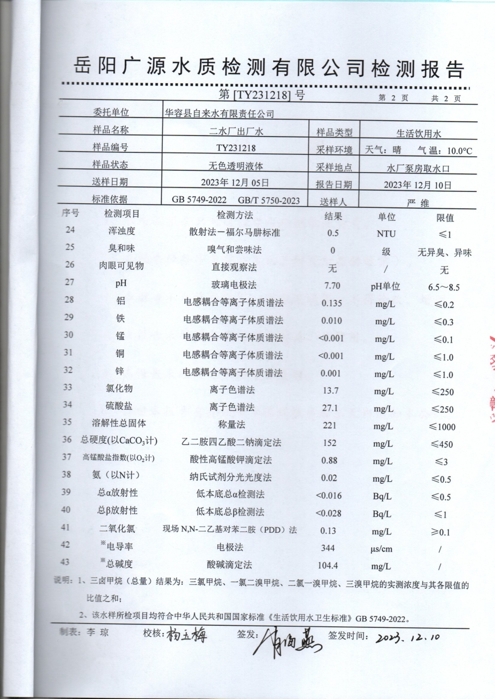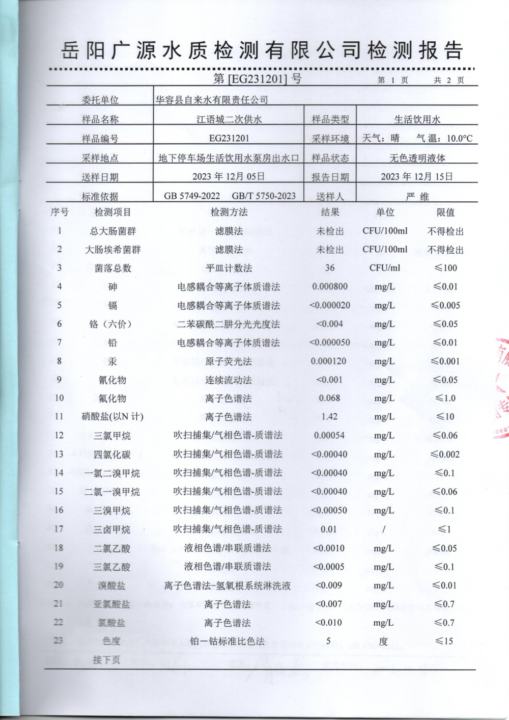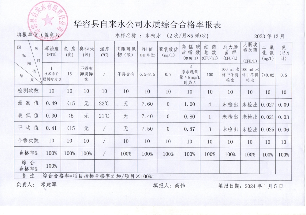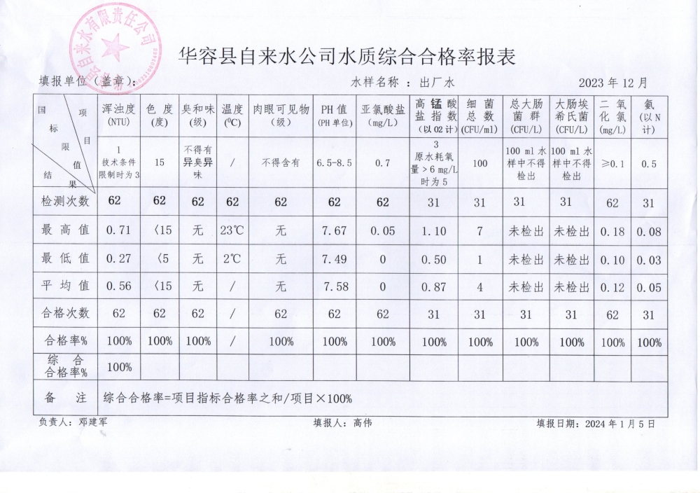 华容县自来水有限责任公司2023年12月水质信息公开