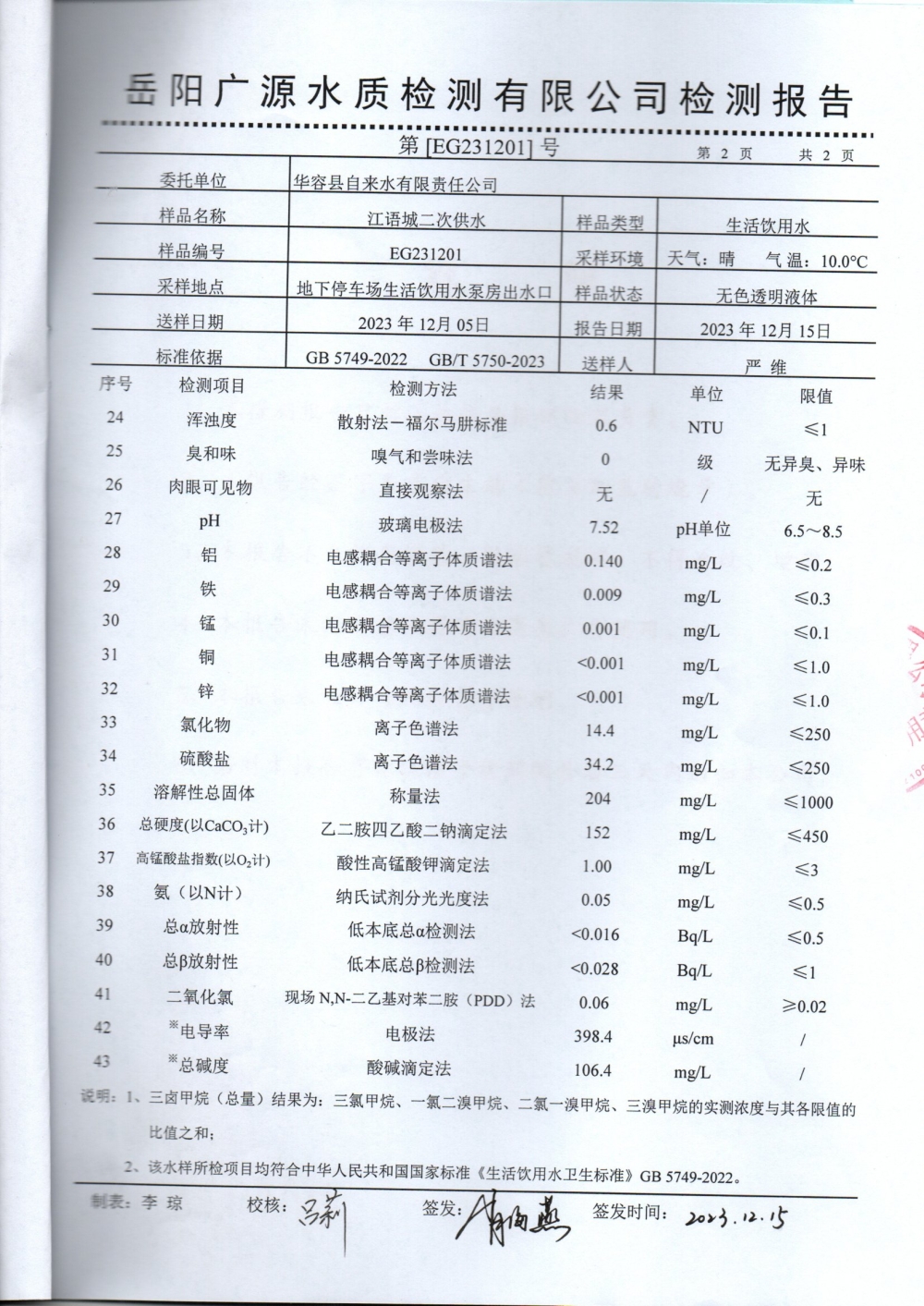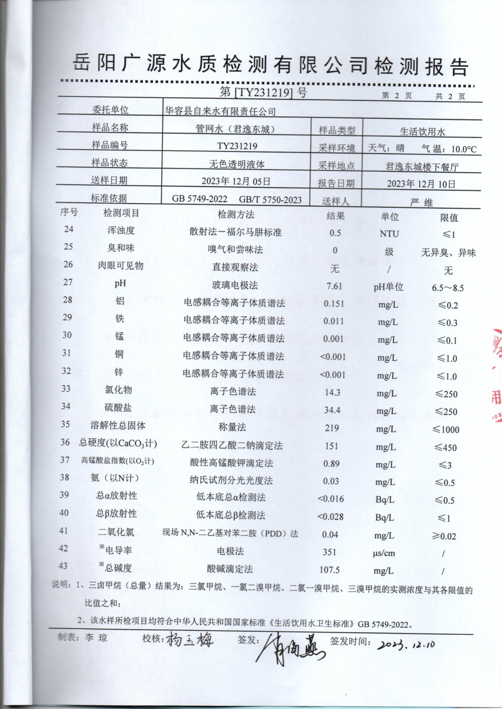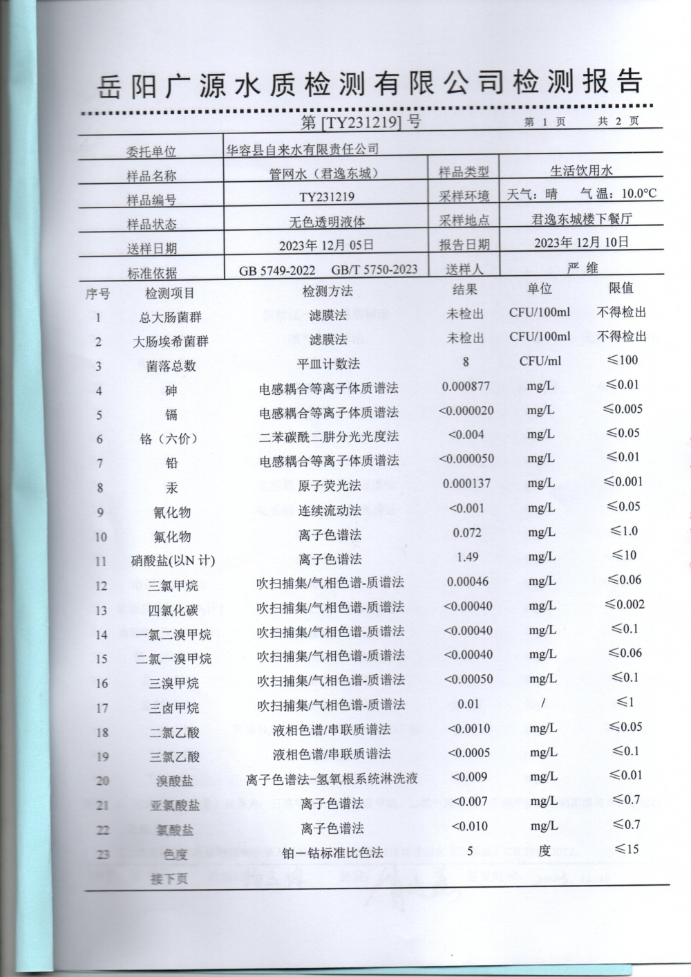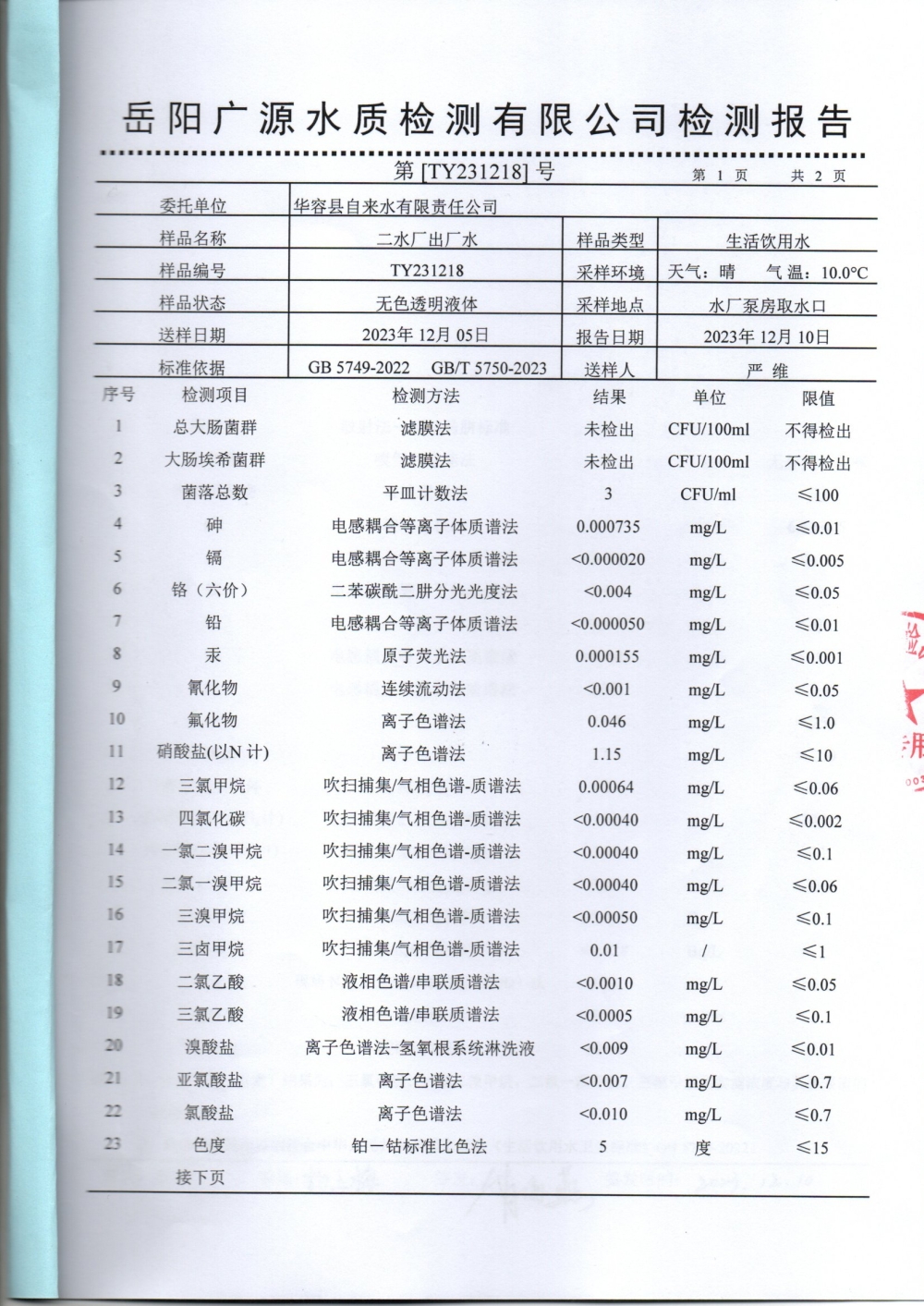 华容县自来水有限责任公司2023年12月水质信息公开