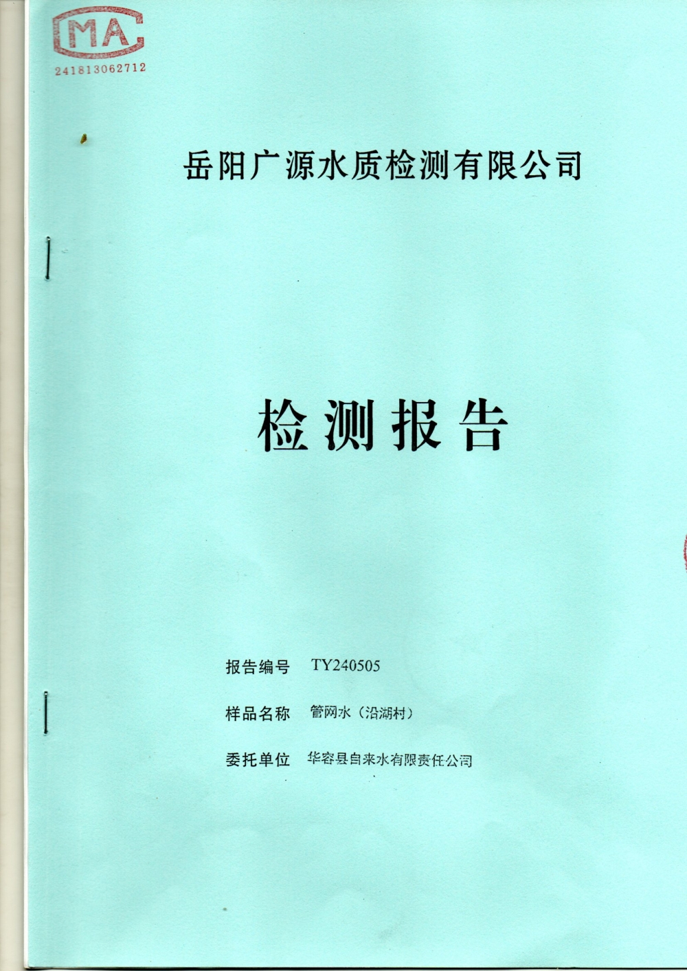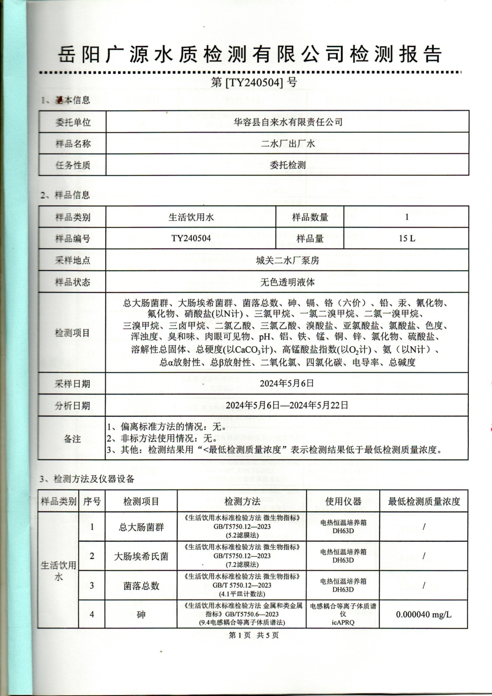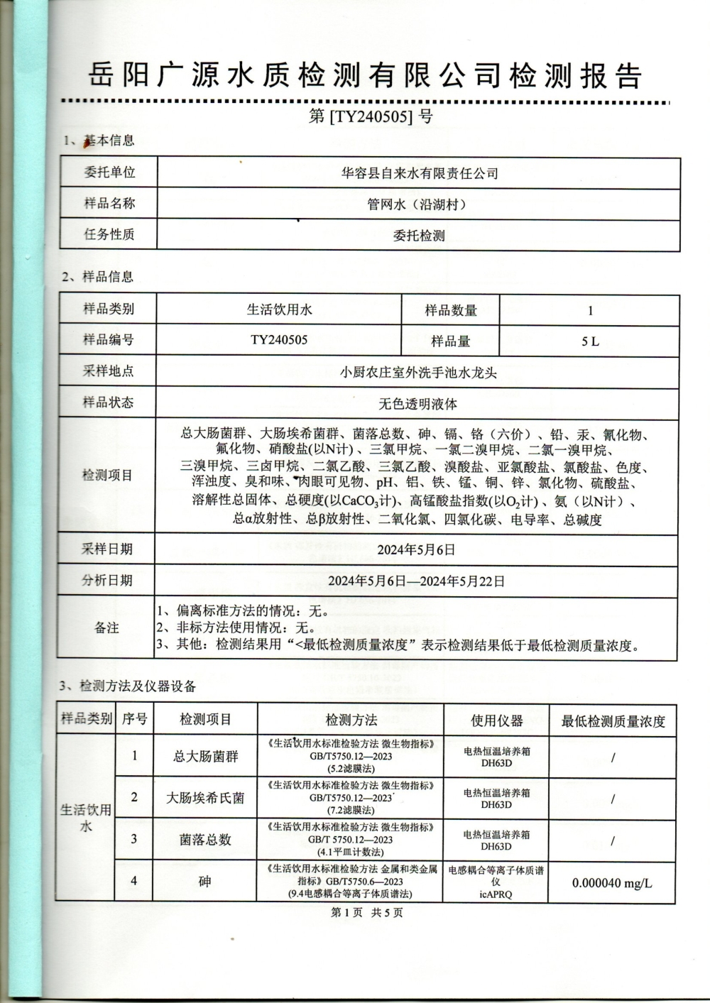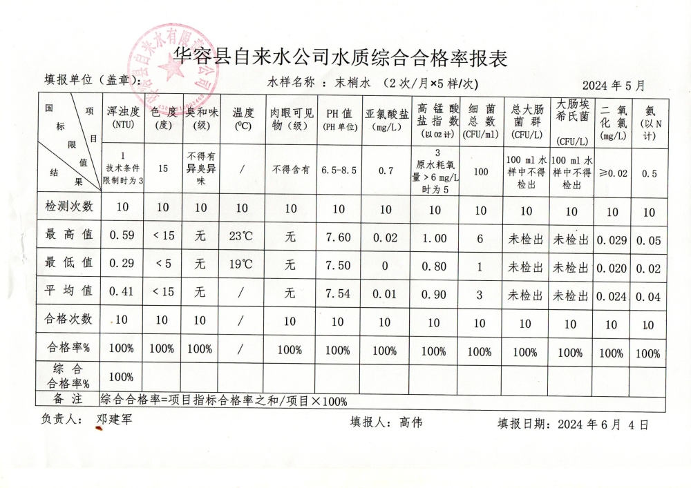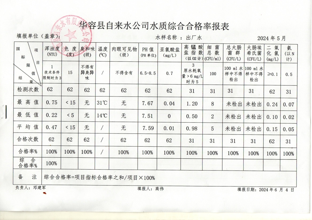 华容县自来水有限责任公司2024年5月水质信息公开