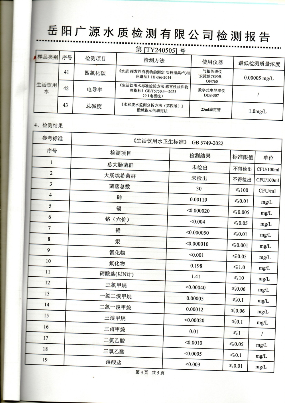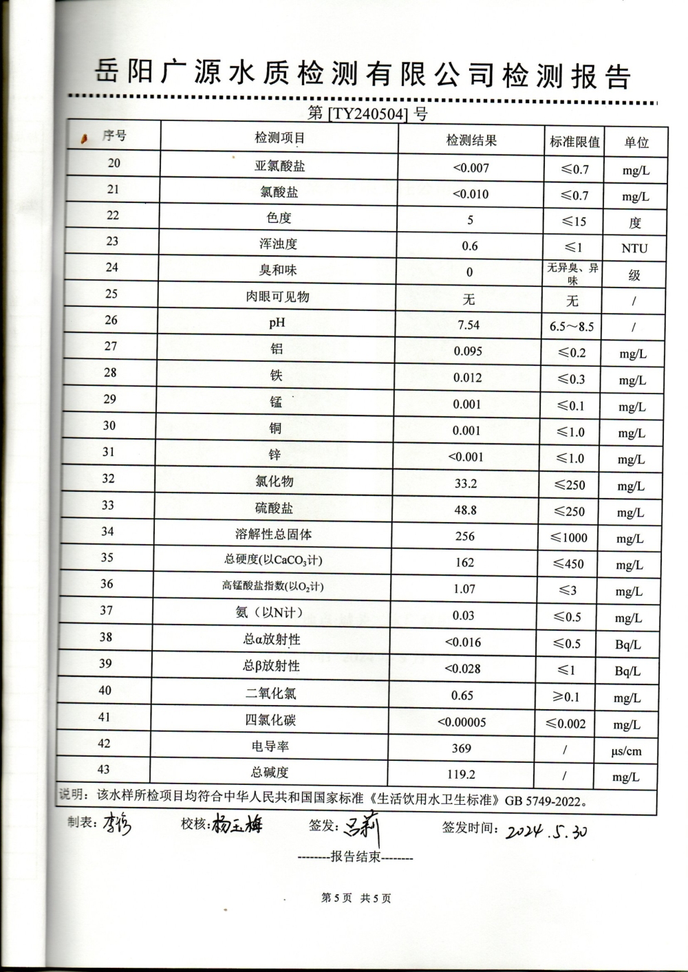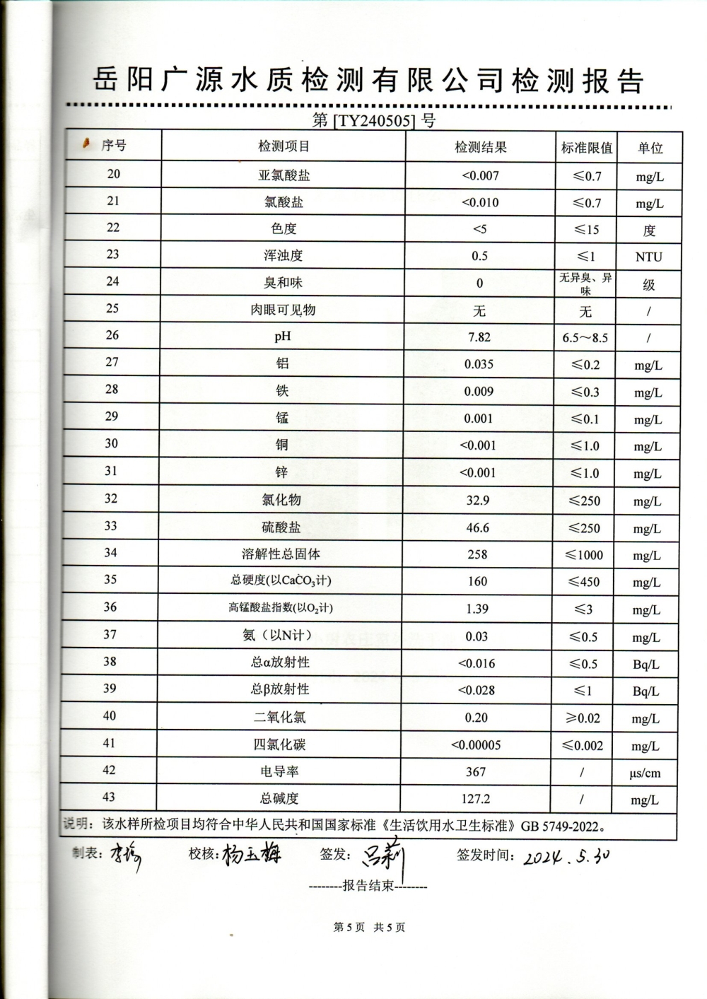 华容县自来水有限责任公司2024年5月水质信息公开