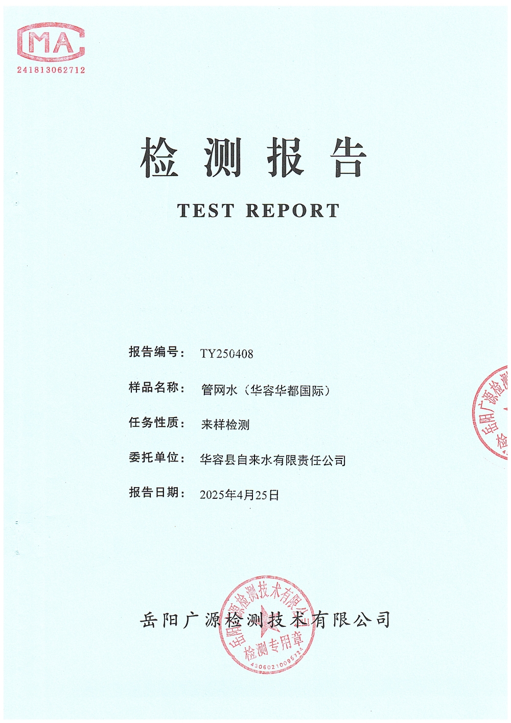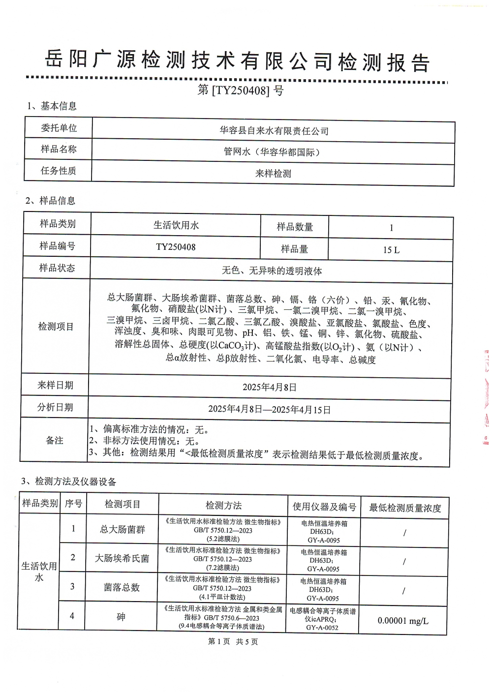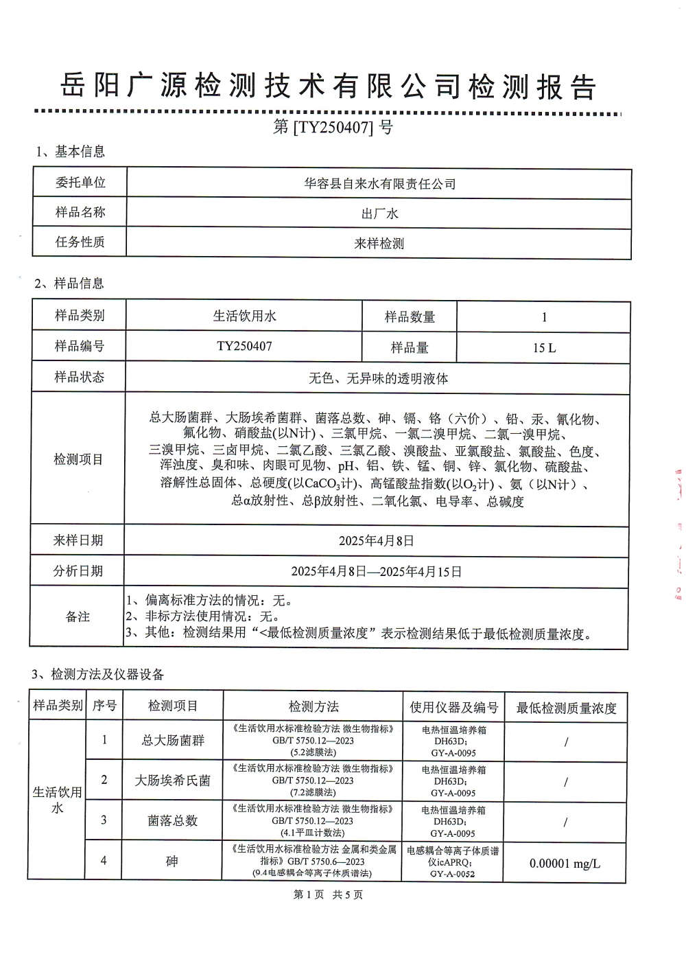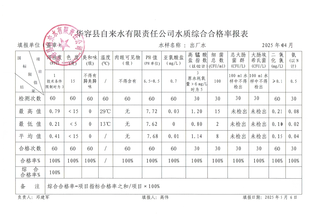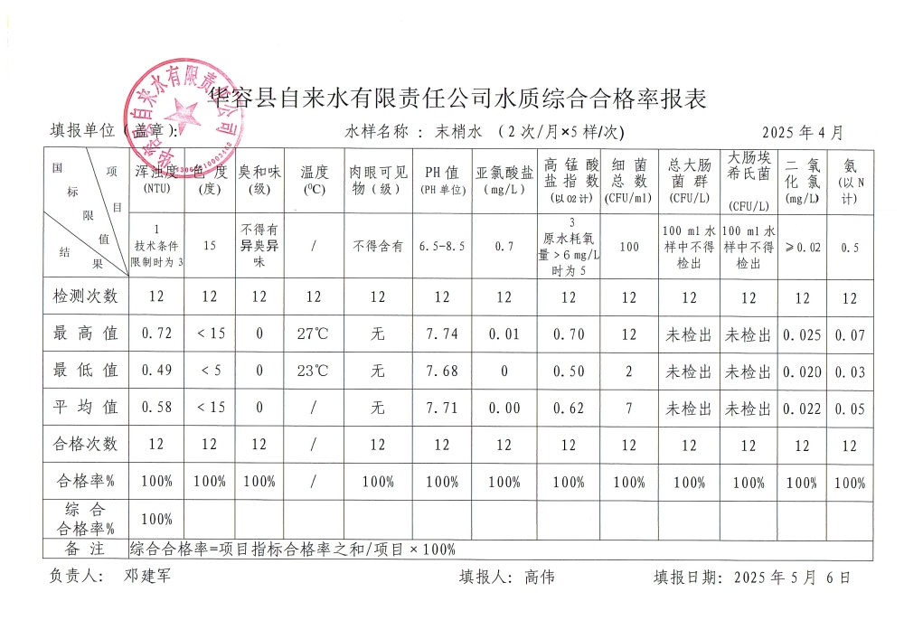 华容县自来水有限责任公司2025年4月水质信息公开