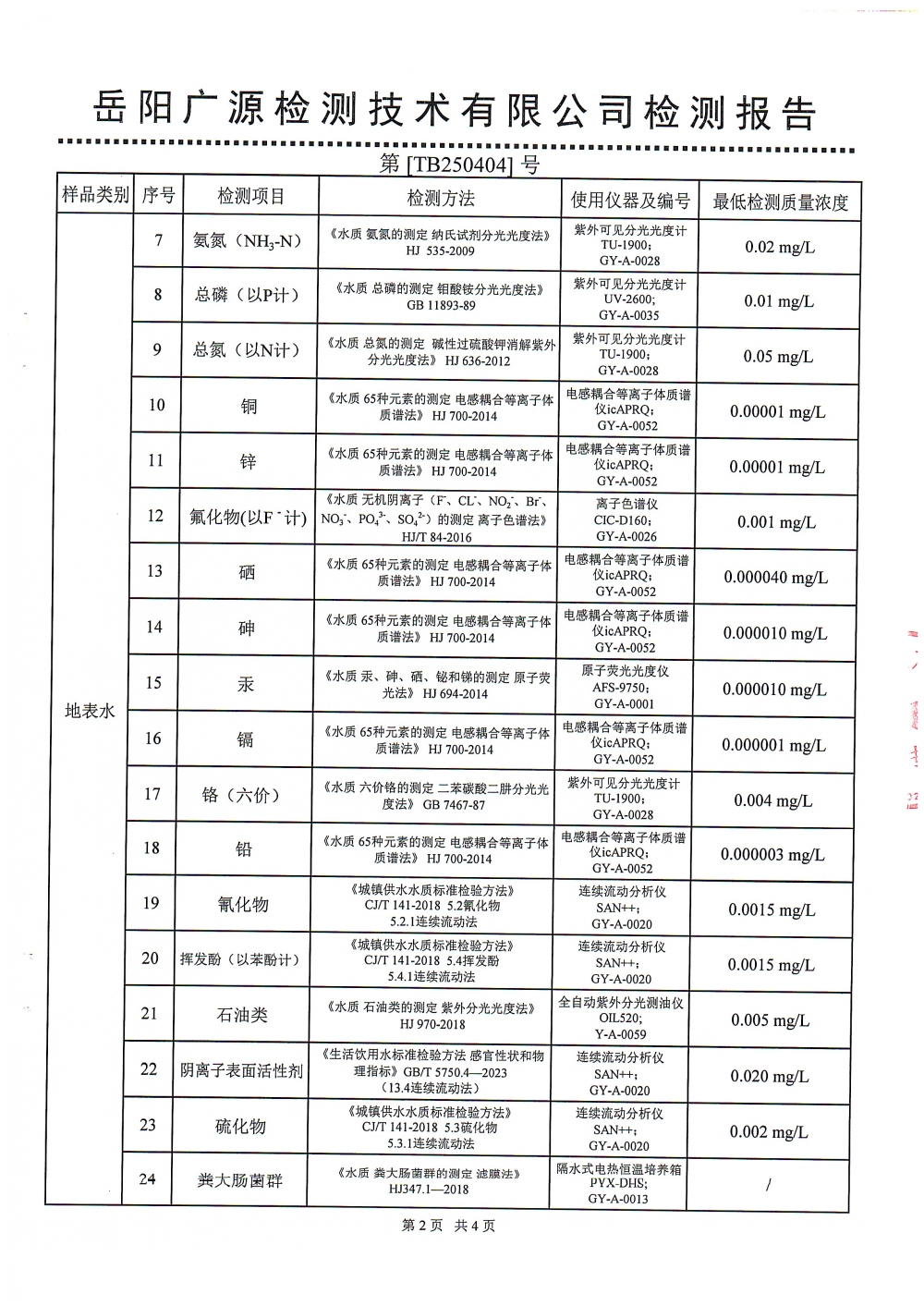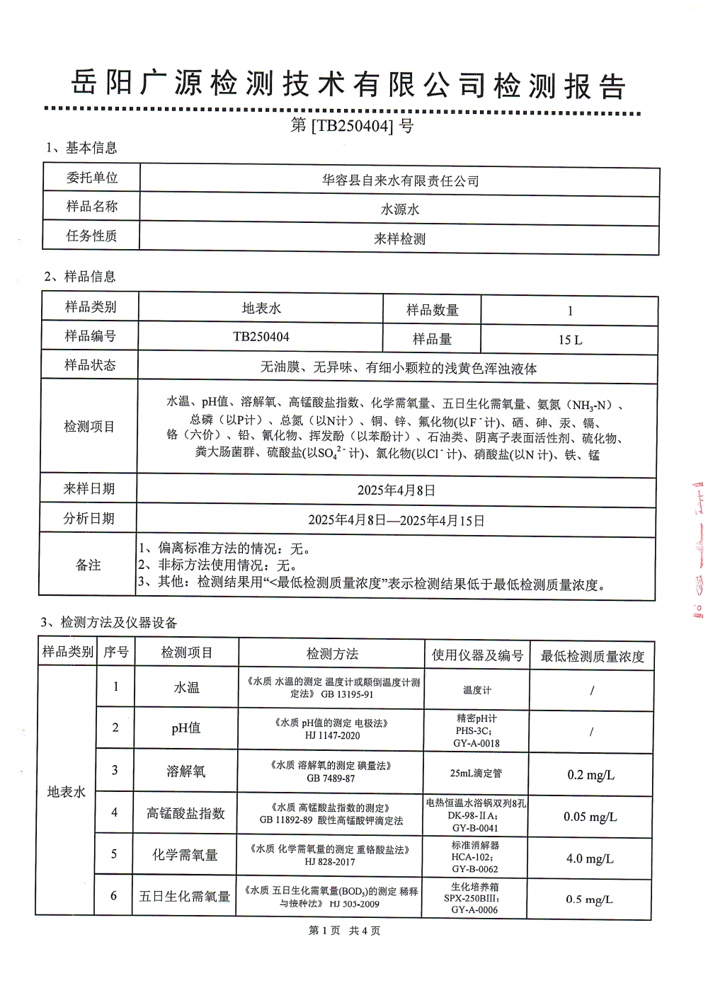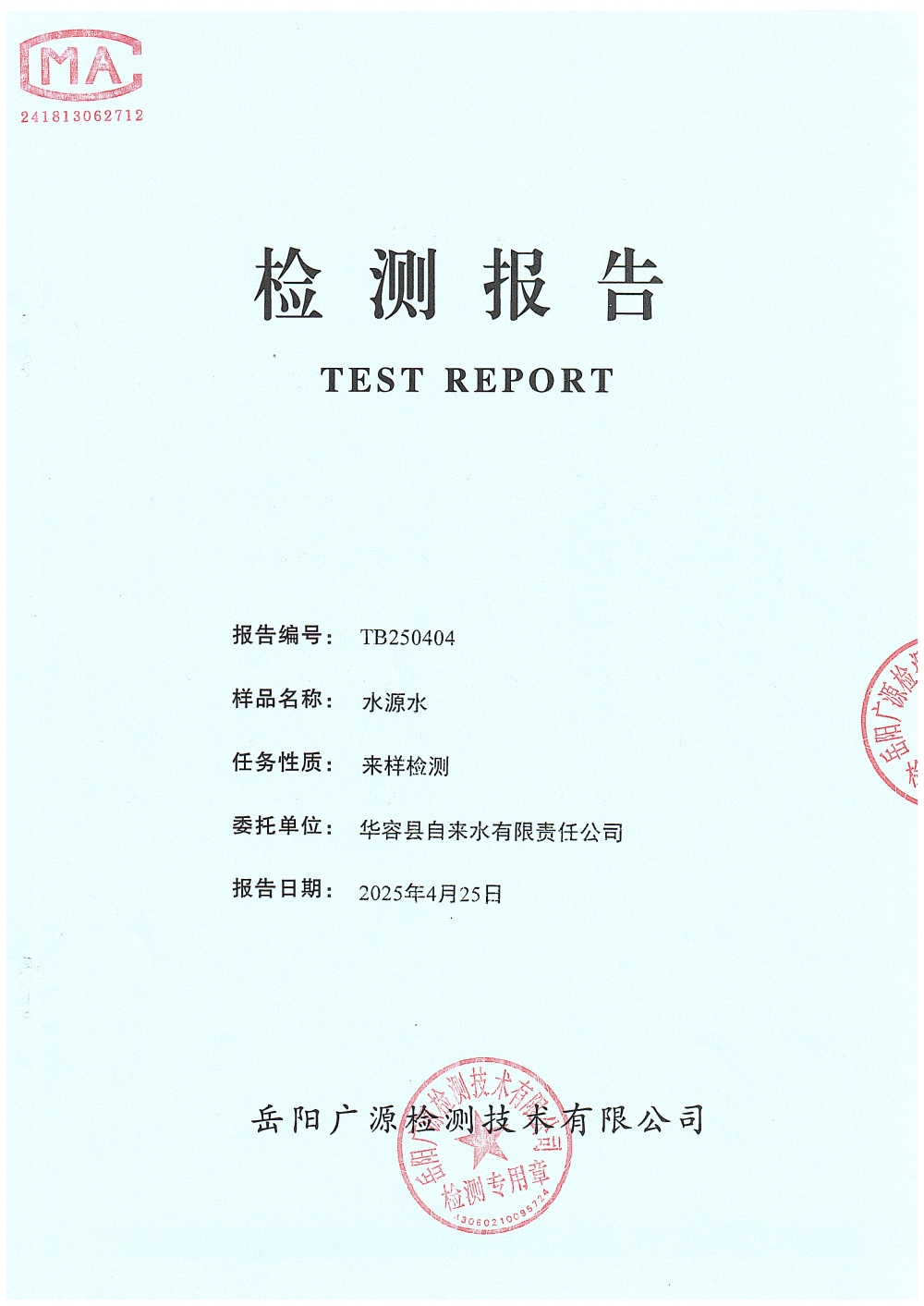 华容县自来水有限责任公司2025年4月水质信息公开