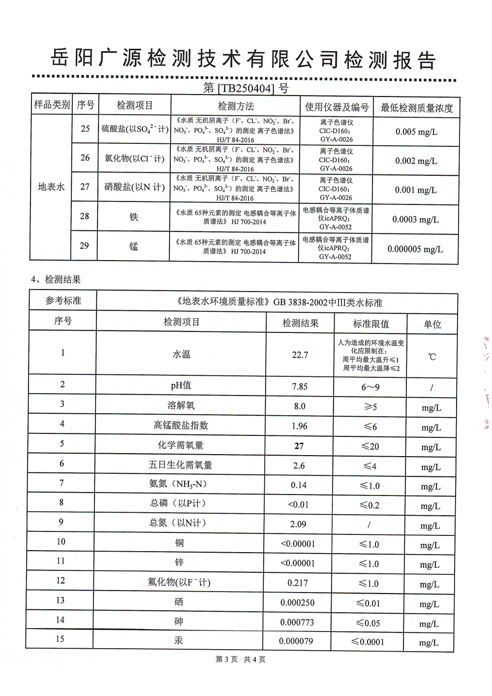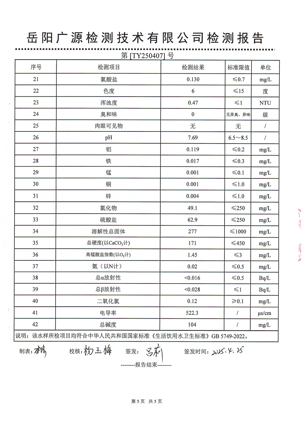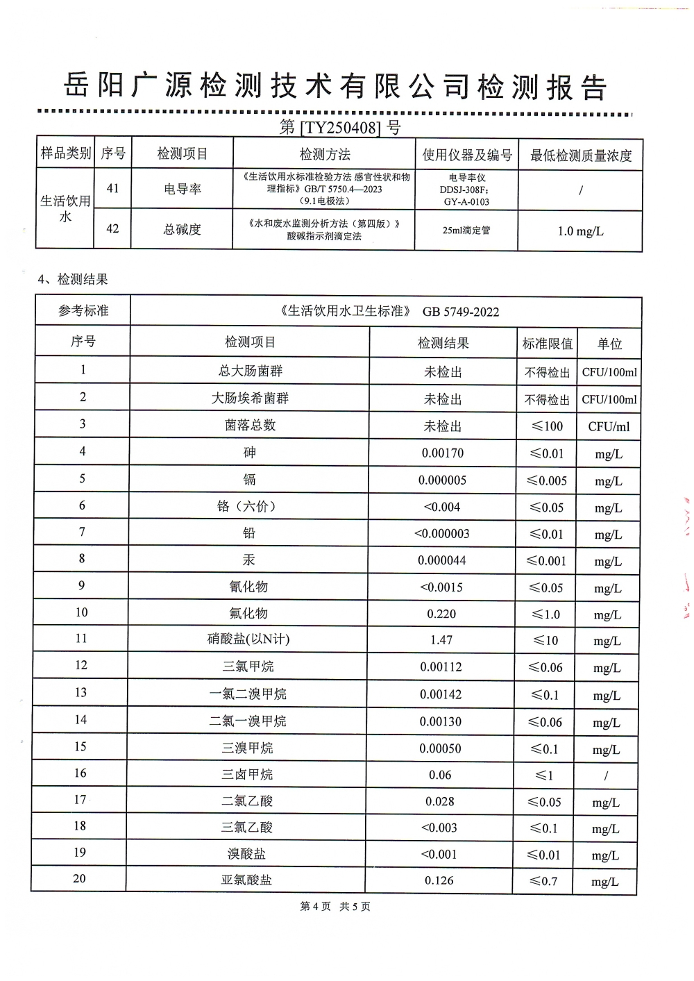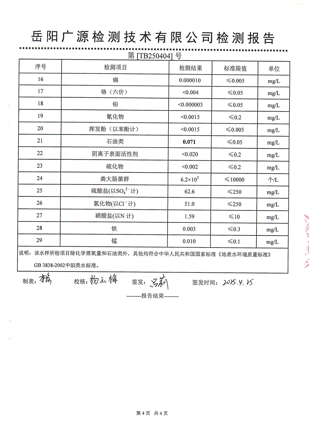 华容县自来水有限责任公司2025年4月水质信息公开