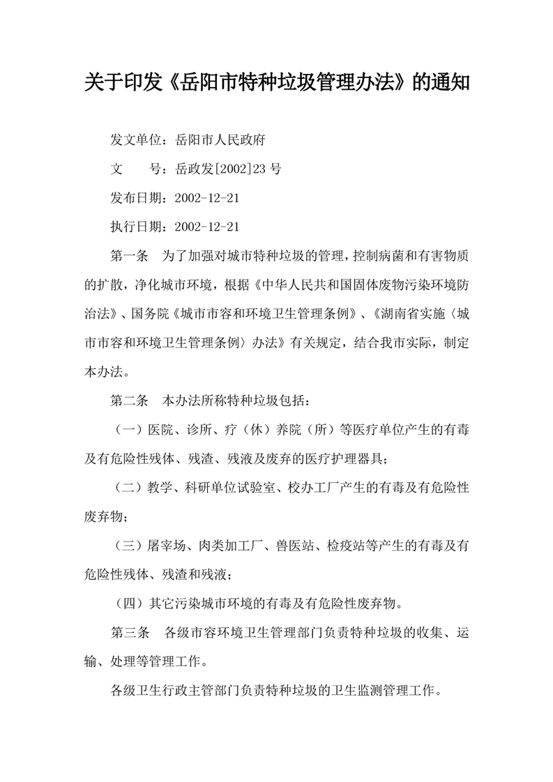 关于印发《岳阳市特种垃圾管理办法》的通知