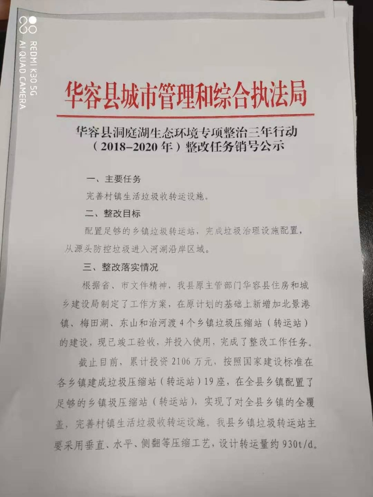 华容县洞庭湖生态环境专项整治三年行动(2018—2020年)整改任务销号公示