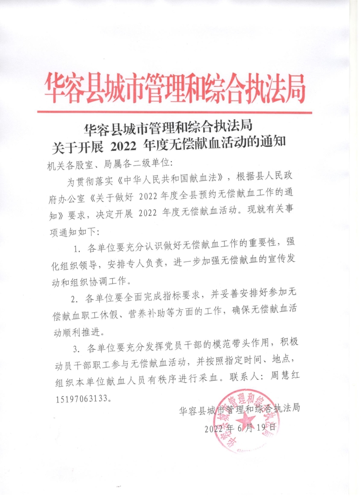华容县城市管理和综合执法局关于开展2022年度无偿献血活动的通知