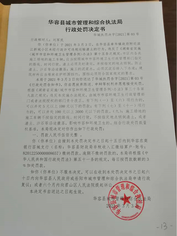 华容县章华镇政府附近滨江新城小区刘某未经行政许可违规运输渣土的行政处罚决定公示