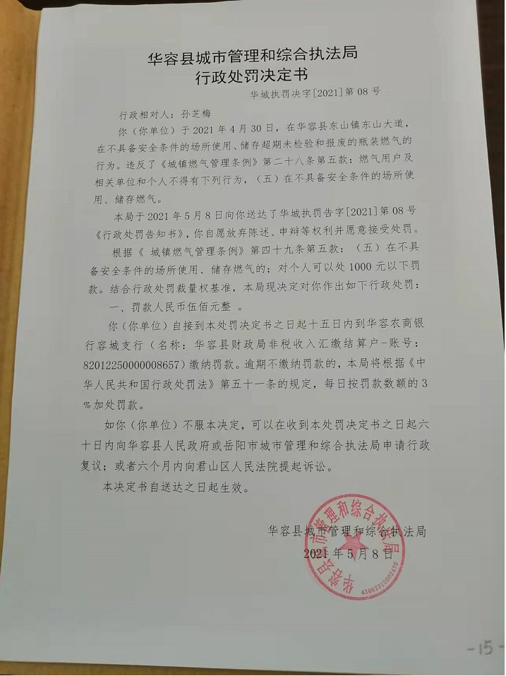 华容县东山镇东山大道孙某在不具备安全条件的场所使用、储存超期未检验和报废的瓶装燃气的行政处罚公示