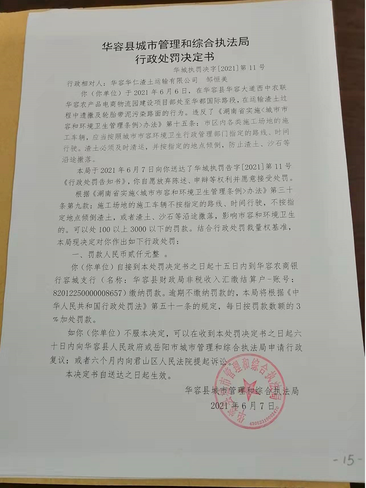 华容华仁渣土运输有限公司在华容大道运输渣土过程中遗撒及轮胎带泥污染路面的行政处罚决定公示