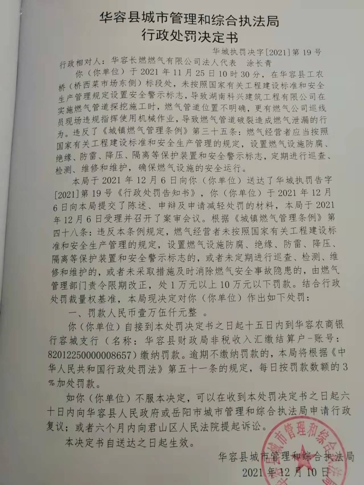 华容长燃燃气公司在工农桥标段处,未设标准和安全生产管理规定警示标志,导致科兴公司作业致燃气泄漏的行政处罚决定公示
