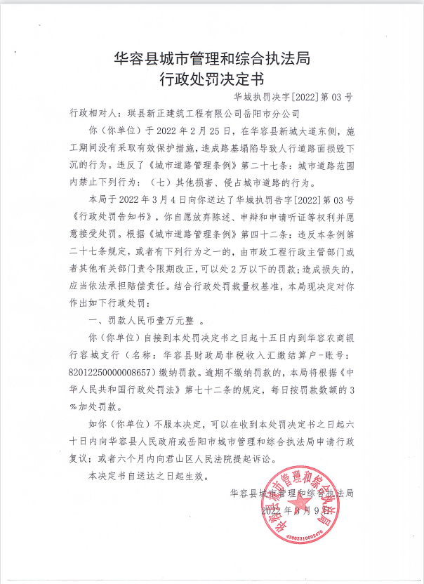 珙县新正建筑工程有限公司岳阳市分公司在华容县新城大道施工期间没有采取保护措施,造成路基塌陷的行政处罚决定公示